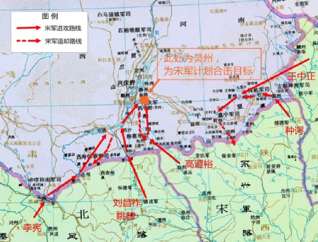 第三路,环庆路方向,高遵裕为统帅,率人马八万七千人以及九万五千人的后勤部队,重装出击,主攻灵州(西夏陪都,称西平府)。