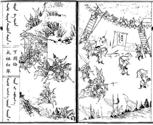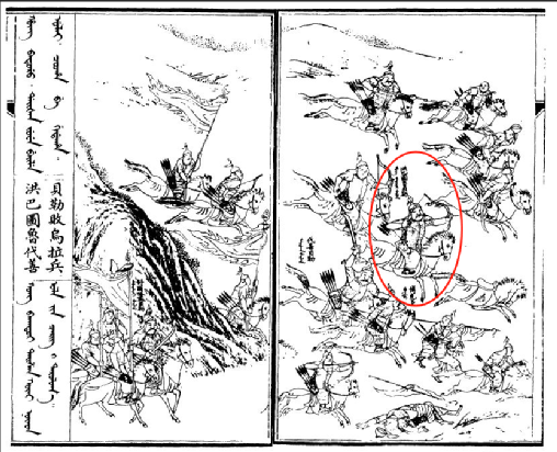 《满洲实录》中描绘的乌碣岩大战,红圈内的人物为“洪巴图鲁”,即褚英