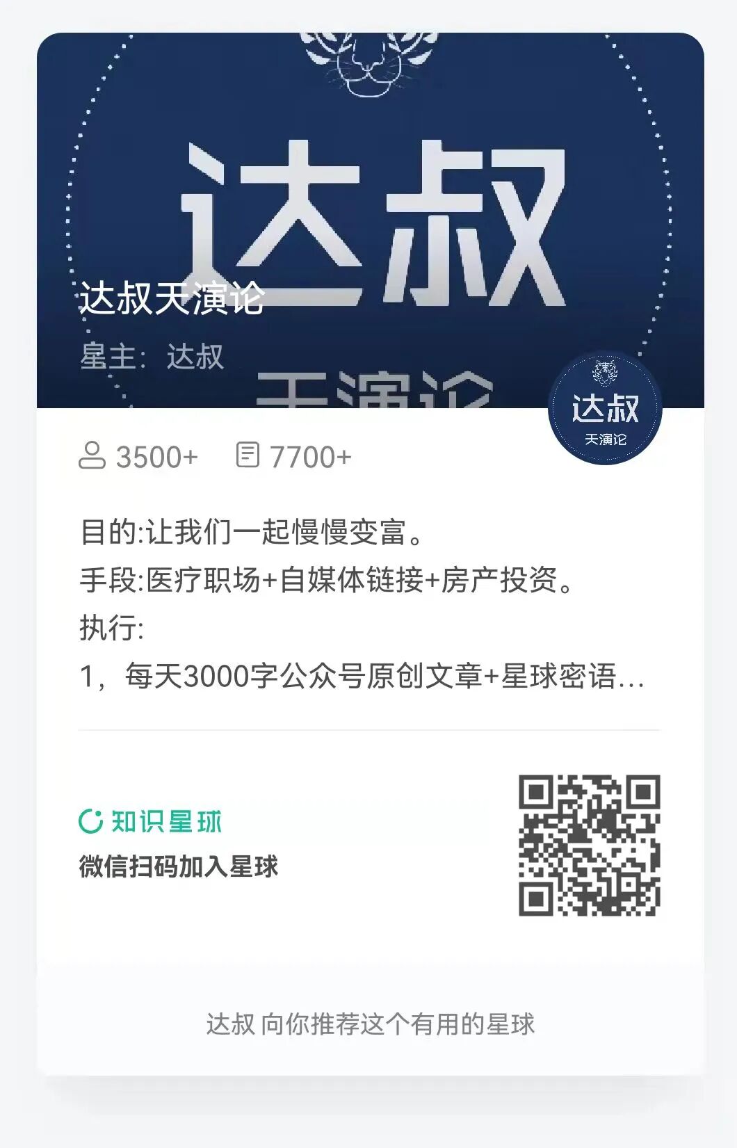 2、加入达叔的知识星球,医生、律师、医疗、房产、教师、投资人等,数千位专心赚钱的人,等你来链接,欢迎提交项目,达叔微天使投资。
