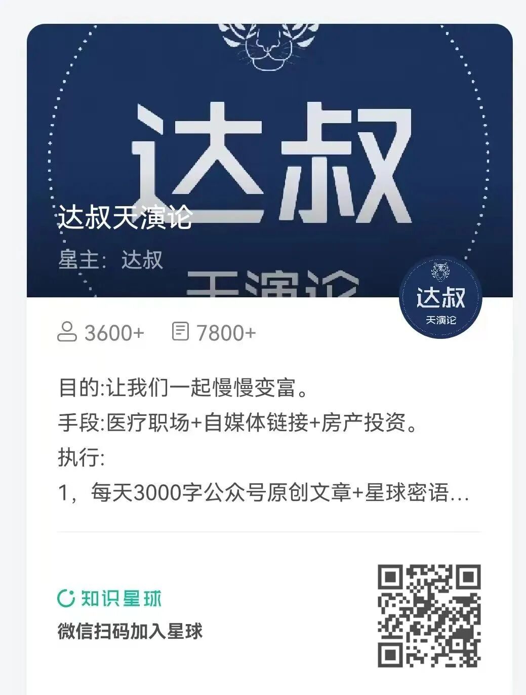 2、加入达叔的知识星球,医生、律师、医疗、房产、教师、投资人等,数千位专心赚钱的人,等你来链接,欢迎提交项目,达叔微天使投资。