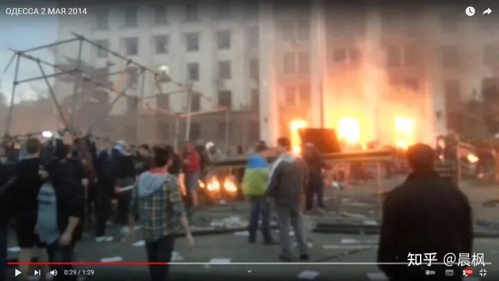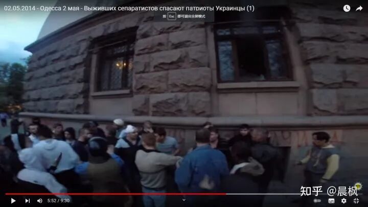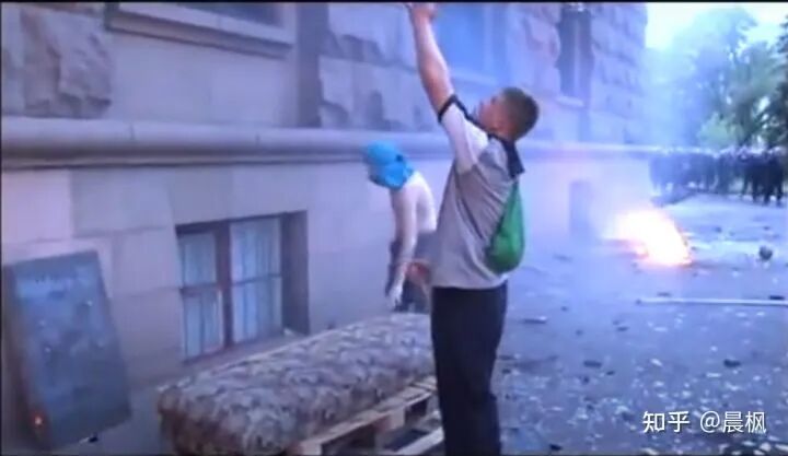 (装备了突击步枪和盾牌,钢盔的俄族和平示威者)链接如下:可以直接打开Одесская трагедия: "антимайдановец" Боцман стрелял из огнестрельного оружия如俄族开枪暴行瞬间点燃了群众怒火,大批乌族示威者拿着棍棒从正面进入现场拆除营地并且想抓拿"恐怖分子",多数俄族认为应该从后方撤离,但是俄族领袖却让他们占据工会大楼与乌族继续对抗!敖德萨工会大楼是一座巨大的钢筋混凝土建筑,被认为是坚固的堡垒。视频中我们可以看到俄族早就在大楼内准备了大量燃烧弹。视频中双方互扔燃烧弹。