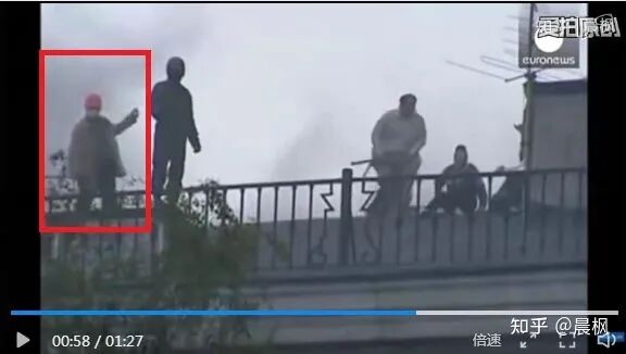 (乌族准备护垫让被困者跳下,旁边用蒙面的所谓极端分子也在帮忙)