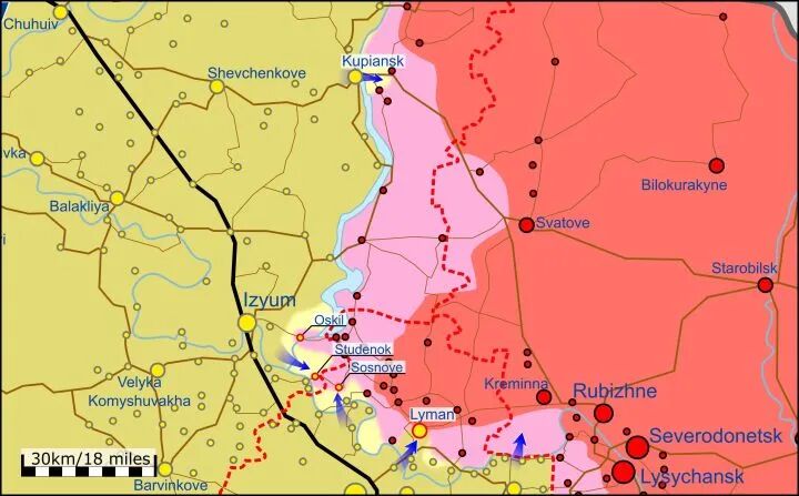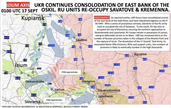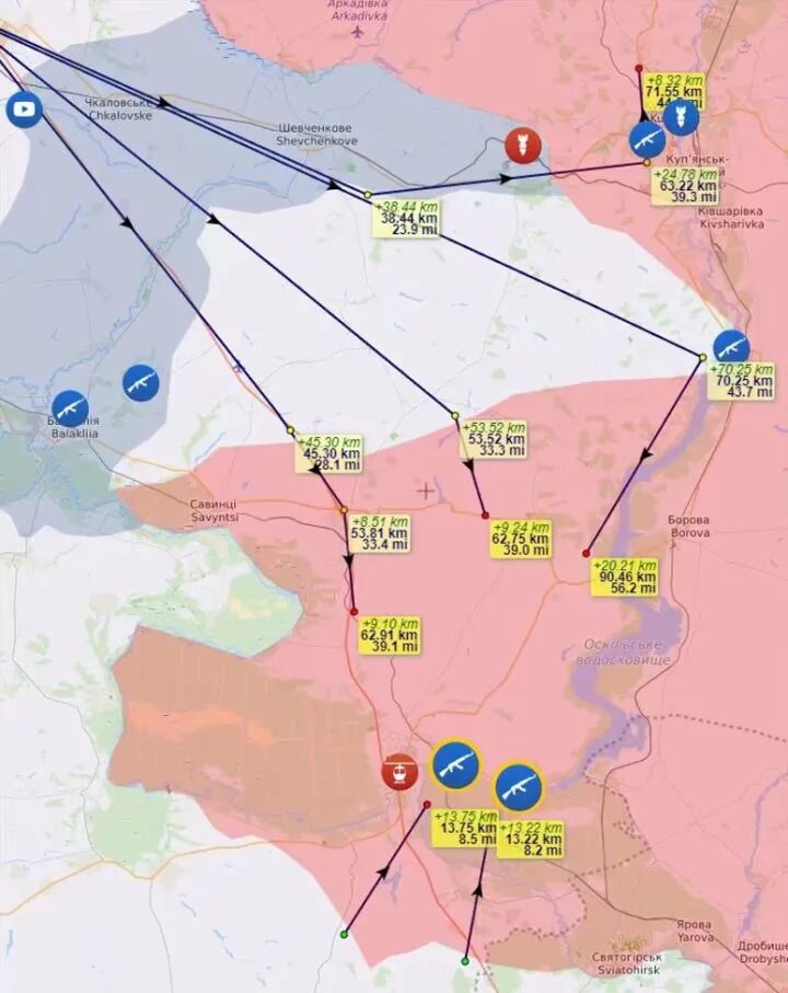 Ⅲ 伊久姆哈尔科夫一线一览;乌军九月初发动的伊久姆反击战可谓现代军事史上罕见且辉煌的“闪击战范例”,不到一天时间乌军就打穿了伊久姆集群的防线且事实上已经击溃了这个集群。无法想象,直面乌军哈尔科夫和伊久姆西部主力集群的俄军伊久姆集群的防线不能说是纸糊的,也可以说是保鲜膜做的,经营了几个月的筑垒地域不到一天就被冲烂了。乌军伊久姆反击战三天夺取的土地,是俄军过去四个月的总和,这下乌军真的有曼施坦因了。从整体来看,事实上伊久姆战役能取得这样的战果是十分不可思议的,先不说乌方信息源几次事先宣传“可能在伊久姆方向发动进攻”,再说乌军几个旅一级单位近2w人规模的战役集结俄军事先都没有任何察觉,并且做出相应的反制措施,乃至伊久姆防线告急失守三天后俄军的增援部队都没有派出援军。可见俄军已经没有足够的战役预备队来快速填补前线的崩溃,俄军在伊久姆丢弃了至少200件的重型装备,这些重武器足够武装2-3个机械化旅,可见俄罗斯国防部宣称的”有秩序“撤退和”恐慌性“追击和现实情况是刚好相反的。由于伊久姆集群的迅速崩溃,且乌军在哈尔科夫一线也发起了大规模的地面攻势。因此,可以合理推测此处的俄军可能在接收到了撤退命令之后进行恐慌性撤退,或许他们根本没有收到命令。(这已经在一些部队里面发生了)哈尔科夫城方向的反击相对伊久姆来说乏善可陈,大多数的地区被和平接管,一些地区只爆发了小规模的战斗。短短一个星期时间,近8500平方公里的土地被乌军在这个方向收复,俄军半年战果功亏一篑,小规模的乌军甚至冲进了重兵云集的别尔哥罗德。事实上,打败俄军的并不是乌克兰人的坦克,而是恐惧。冲在一线的并不是乌军的重机械化部队,而是轻装甲车辆的摩托化步兵。俄军缺乏的并不是重武器也不是兵力,甚至不是所谓的”战术素养“和”技战术技巧“,只要这些俄军敢于用手上的重装备进行反击,乌军的进攻就不会这么顺利甚至被挫败。奥斯基尔河挡不住乌克兰人的进攻,到我写这篇文章的前几个小时,乌军已经拿下库皮扬斯克东城,整个奥斯基尔河防线已经崩溃,部分机械化部队已经过河,先头部队正在向东发展!显然,即使一个星期时间过去了,这个方向的俄军也没有形成强有力的防线,他们会为他们的失误付出代价的!目前来看,溃散的20集团军和近卫坦克4师被俘了至少2000人,可以肯定的说”20集团军作为一支战略力量实际上已经不复存在!“【指的是20集团军已经失去了战斗力而不是其战斗人员被杀伤殆尽】如果没有足够的有坚强意志的预备队在这个方向抑制乌军的攻势,俄军不能指望能依靠现有兵力在此抵挡乌军!这样的话,乌军甚至能从北顿西北的大方向上对该集群宽侧翼造成威胁!