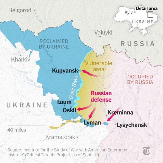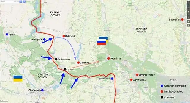 乌军的装甲部队在奥斯基尔南面突破俄军在Karpivka-Ripkodub 一线的的防御工事后,向东机动以切断莱曼北部。