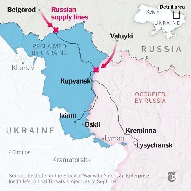 俄军在哈尔科夫东北的溃退,不但丢掉了大量的重要装备(乌克兰国防嘲笑说,俄罗斯这是在努力维持其作为乌克兰军队头号武器供应国的地位),也丢掉了几条连接俄罗斯国内的重要补给线。