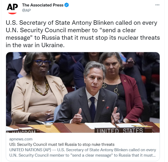美国国务卿布林肯昨天在联合国发表讲话称,俄罗斯的动员是普京最后的挣扎,体现了普京的软弱无力,他还说: