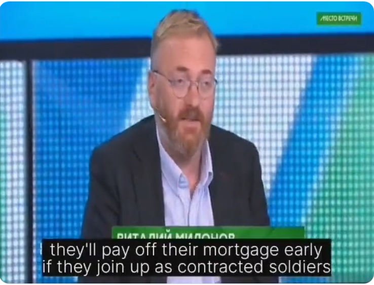 俄罗斯议员Vitaly Milonov表示,大家应该踊跃参军,活着回来的话房贷可以早点还,回不来的话也不用还房贷了。