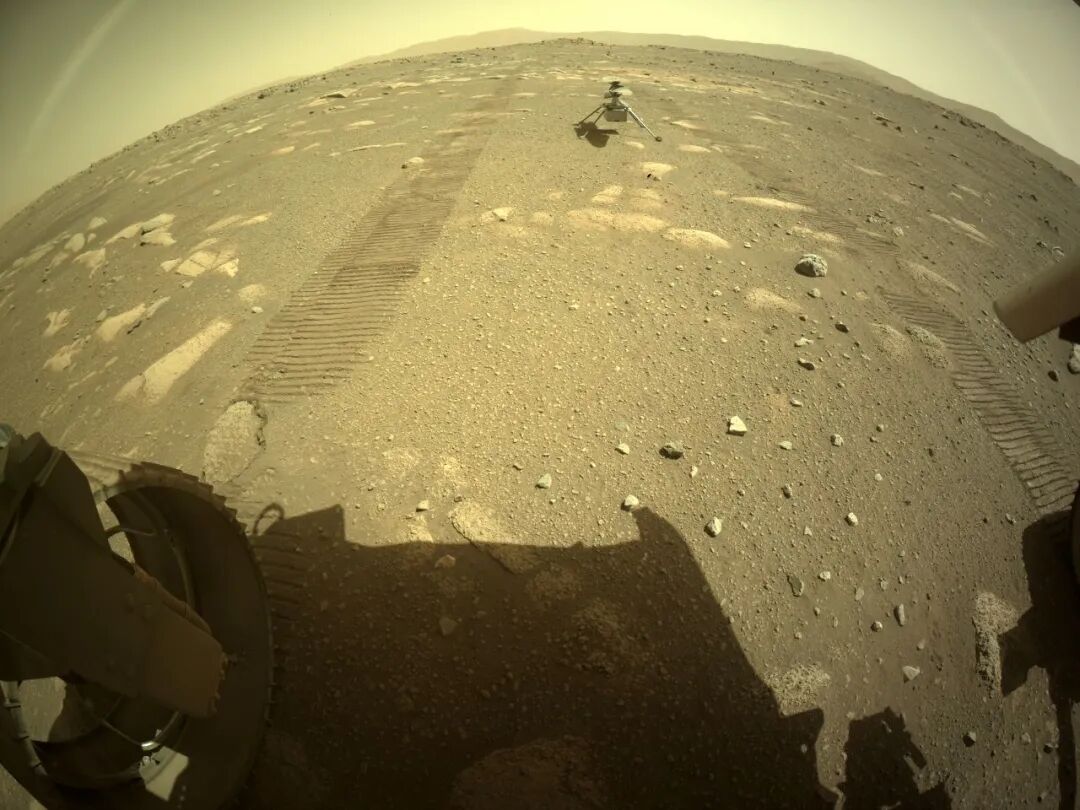 照片是4月3日“灵巧号”被“毅力号”火星车放置到火星表面不久后拍摄的,呈现了“毅力号”所在的“杰泽罗”陨坑表面,以及“毅力号”的两个轮子。