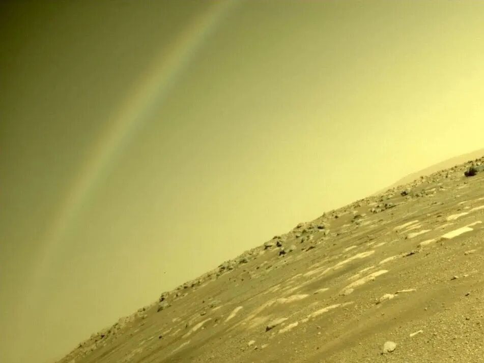 4月4日,“毅力号“火星车在为“灵巧号”起飞做准备的过程中意外地拍到了一道“彩虹”。