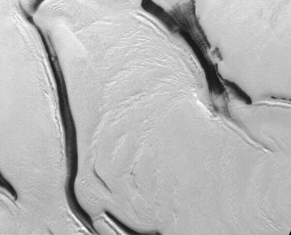 火星南极冰盖区最大的干冰冰川。黑色的是冰川槽谷的边缘。整条冰川的宽度大约为40千米。我们可以在照片的上半部看到冰川表面有很多“褶皱”。这些“褶皱”是因冰川在流动过程中前方干冰因为减速,被后方流速较高的干冰挤压形成的。NASA / MSSS