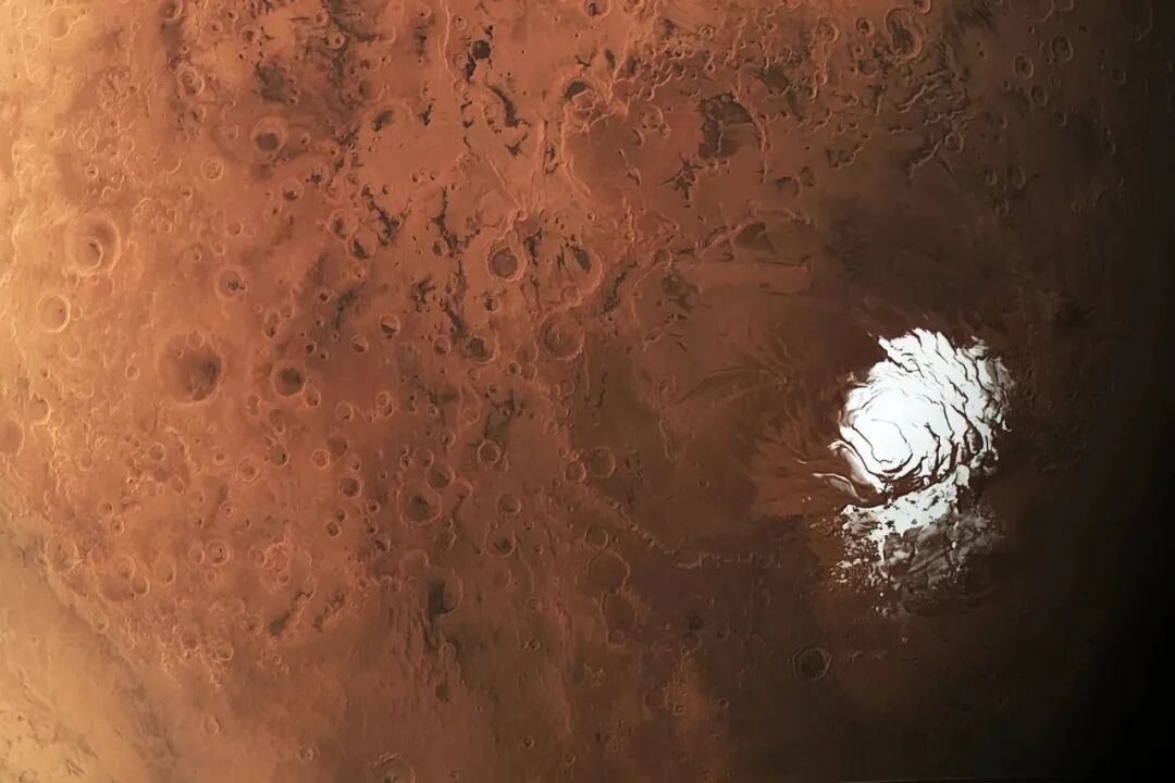 火星快车探测器拍摄的火星南半球及南极冰盖。ESA / DLR / FU Berlin