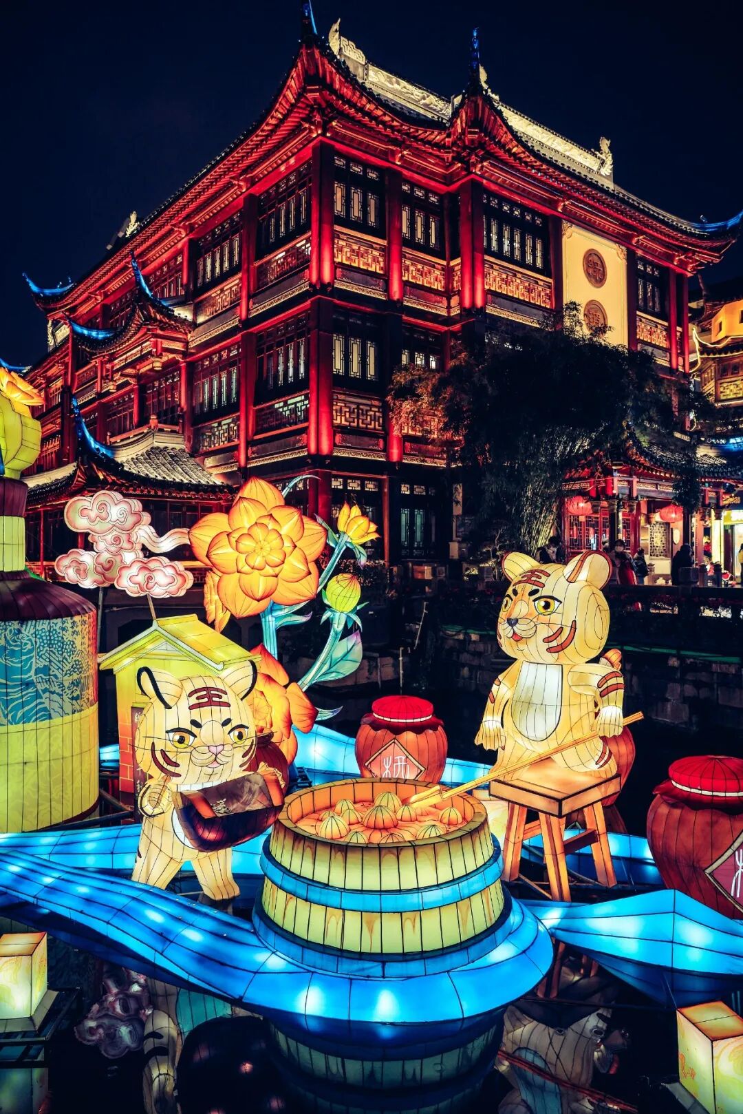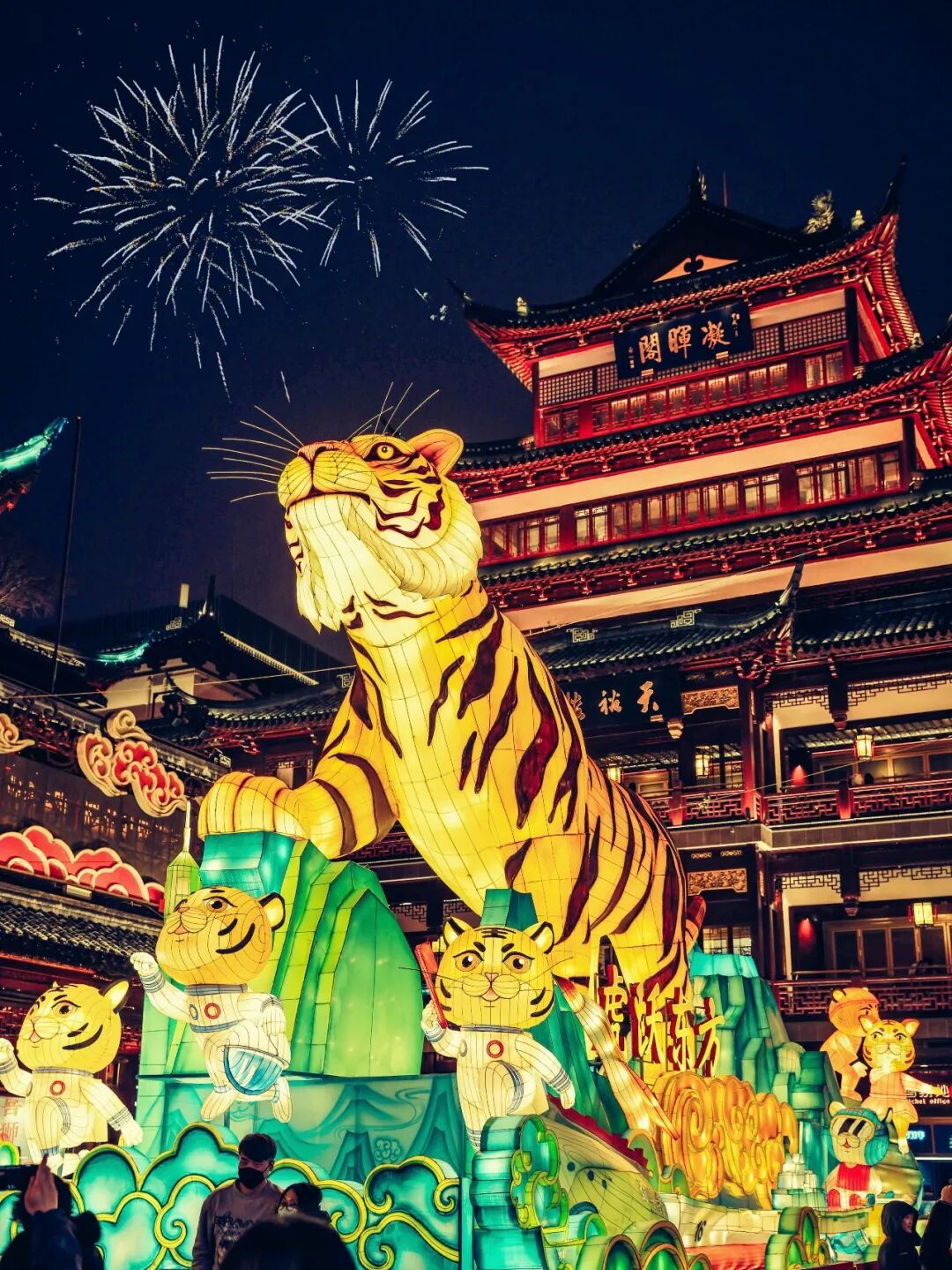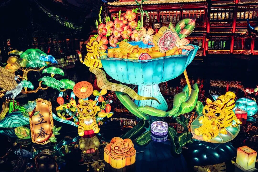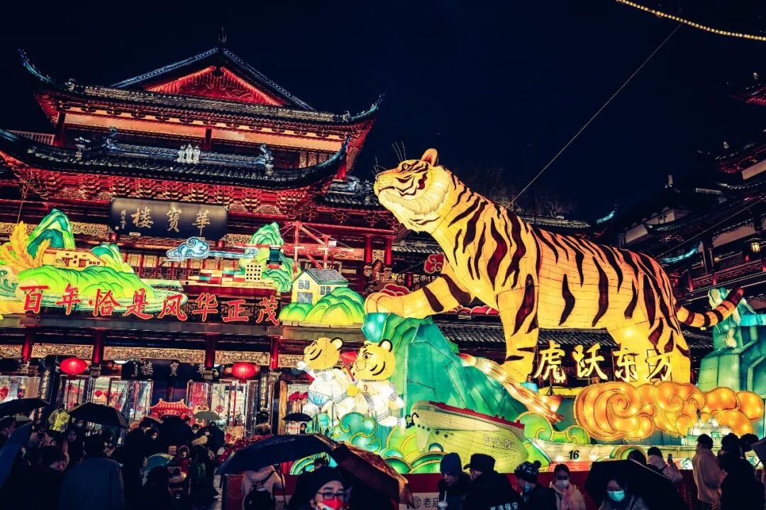 生肖文化作为中国独特的传统文化与年俗息息相关,自然也是灯会的重要部分。虎虎生威的生肖虎作为今年豫园灯会的主角,分布在豫园的各个关键节点。最大的生肖虎灯组被安置在中心广场,栩栩如生的大老虎昂首屹立于苍翠欲滴的山峰,眺望远方,“虎跃东方”的主题与我们对未来美好生活的展望相得益彰。