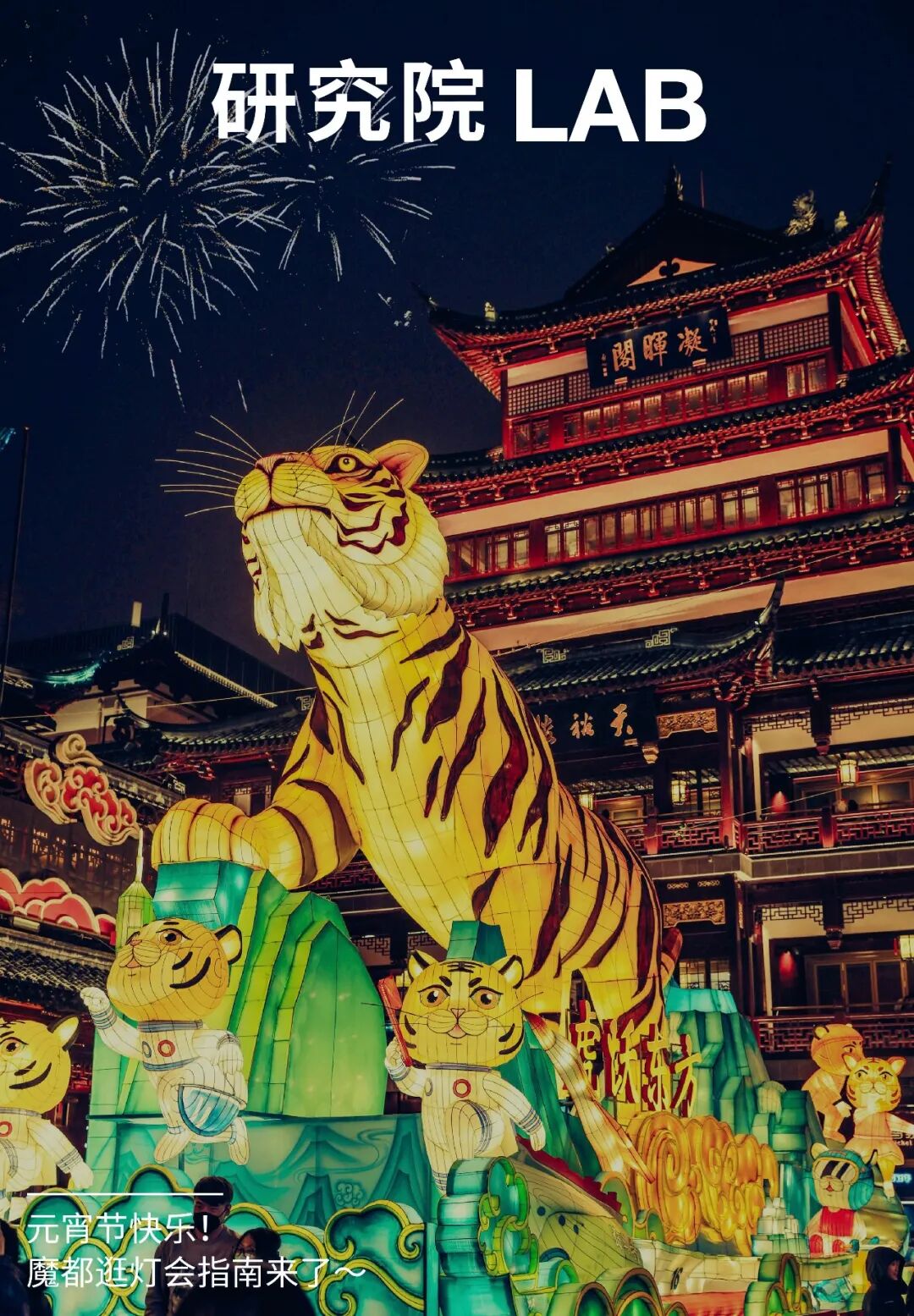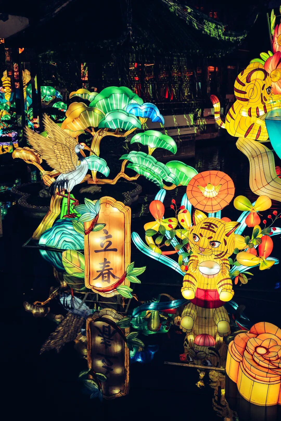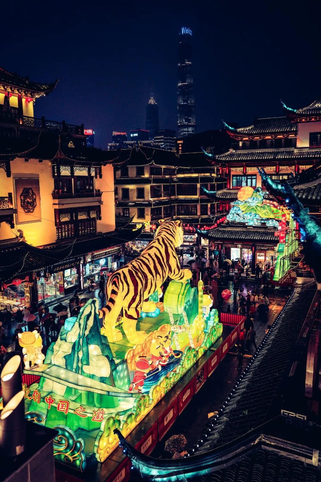 生肖文化作为中国独特的传统文化与年俗息息相关,自然也是灯会的重要部分。虎虎生威的生肖虎作为今年豫园灯会的主角,分布在豫园的各个关键节点。最大的生肖虎灯组被安置在中心广场,栩栩如生的大老虎昂首屹立于苍翠欲滴的山峰,眺望远方,“虎跃东方”的主题与我们对未来美好生活的展望相得益彰。