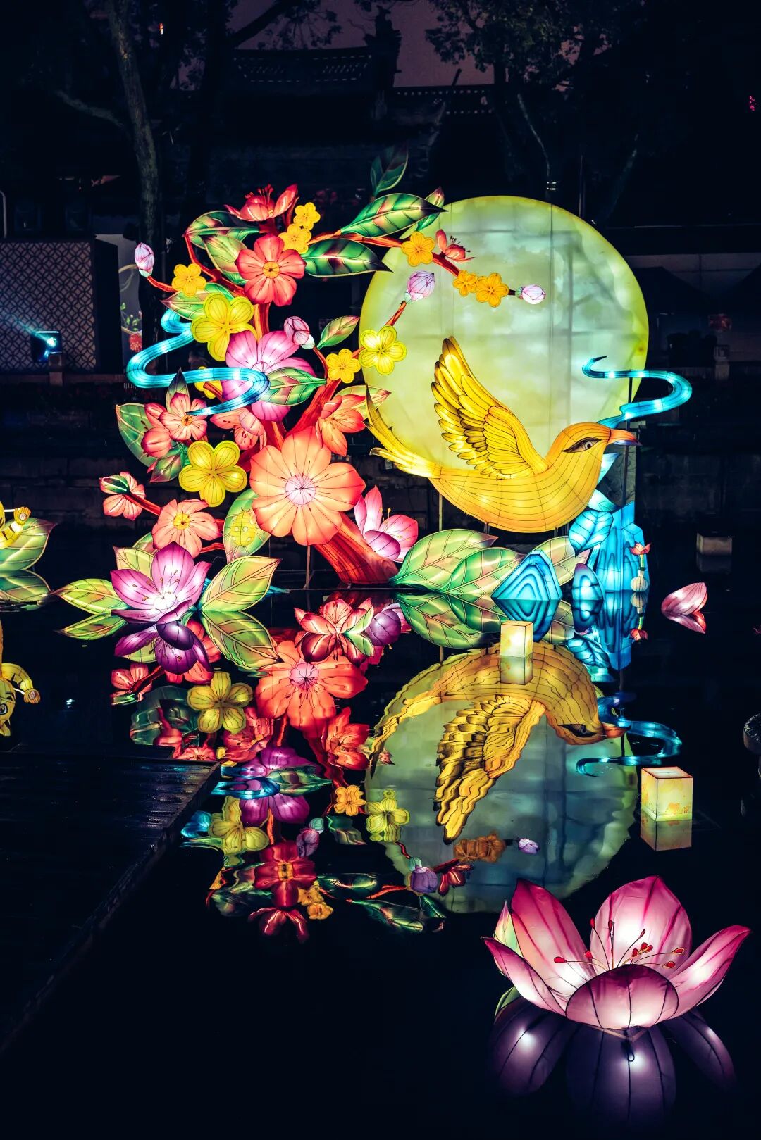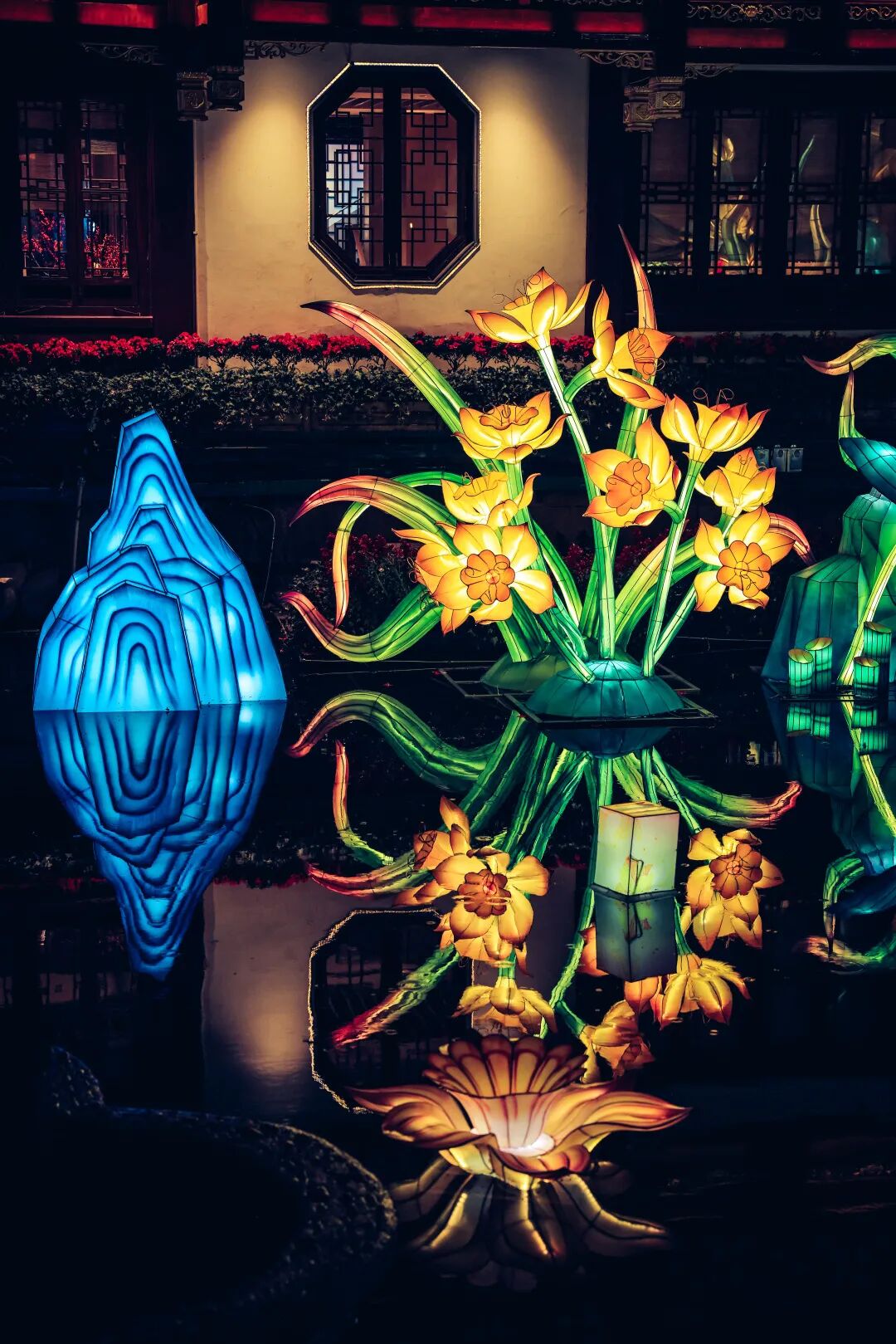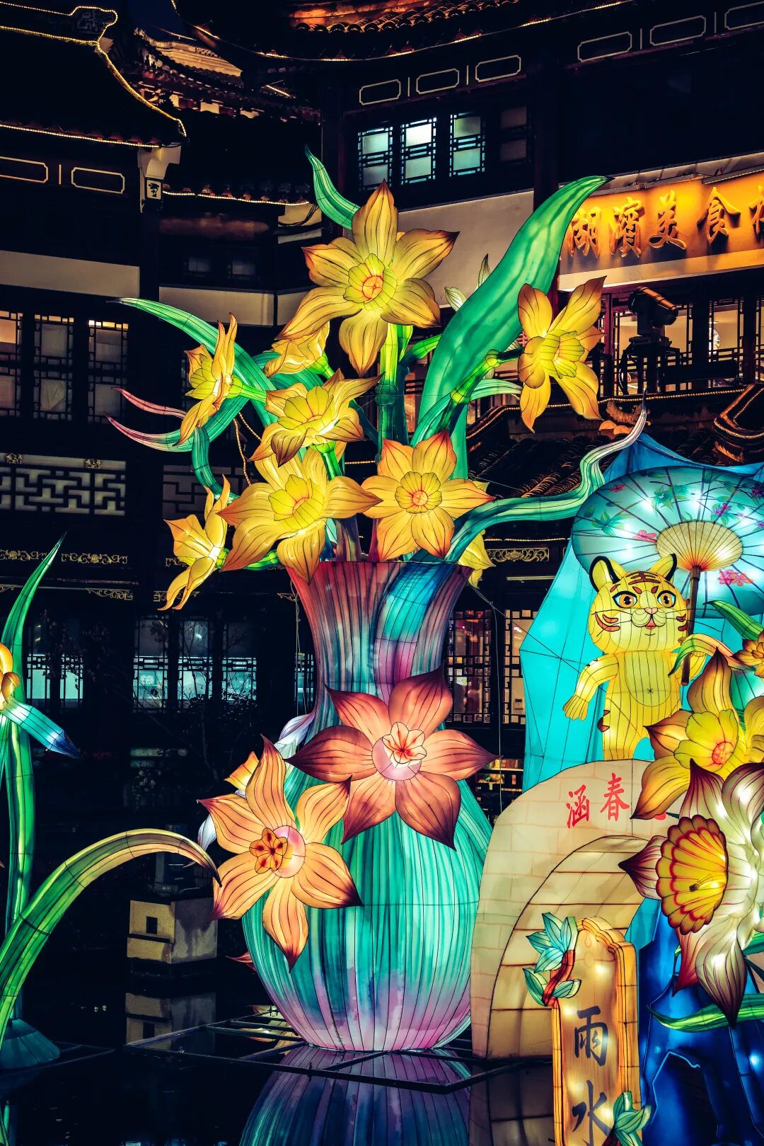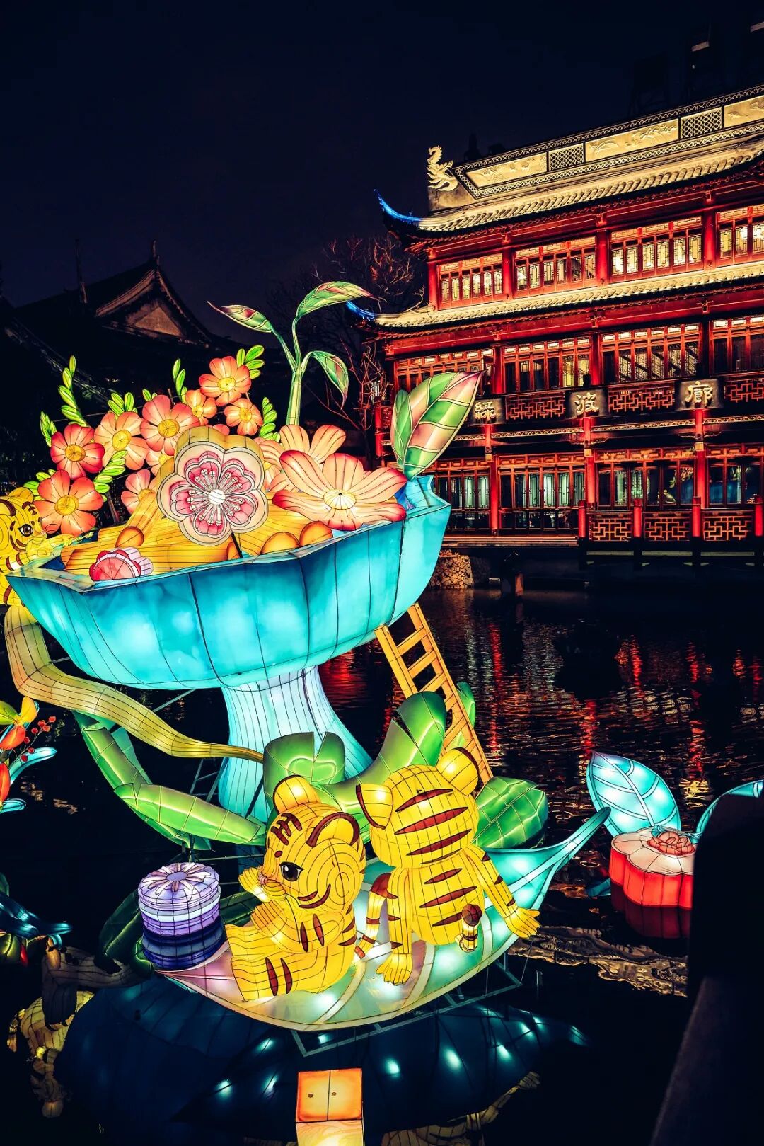 除了豫园灯会千姿百态、各色各样的彩灯灯组外,城隍庙宫灯也是今年灯会的一大亮点。在彩灯、宫灯的掩映下,九曲桥边的挹秀楼比平日增添了几分节日的喜庆。