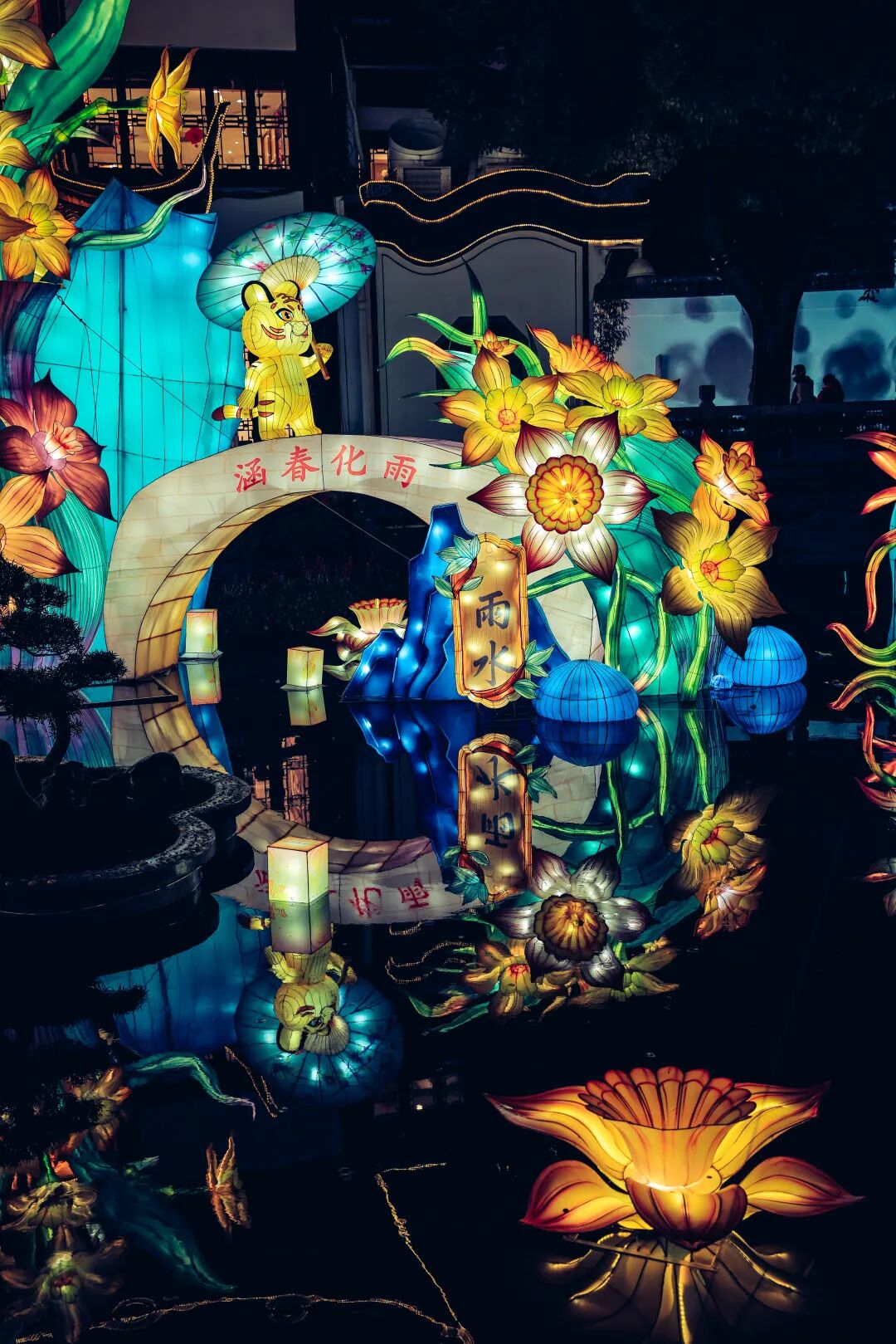 东湖之上一只“小老虎”趴在巨大的碗沿处咬里面的春卷;一只撑着油纸伞的“小老虎”立于北湖之上的“涵春化雨”桥之上,四周被一丛丛巨大的水仙花环绕;灼灼桃花,山月飞鸟;