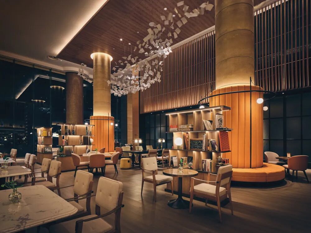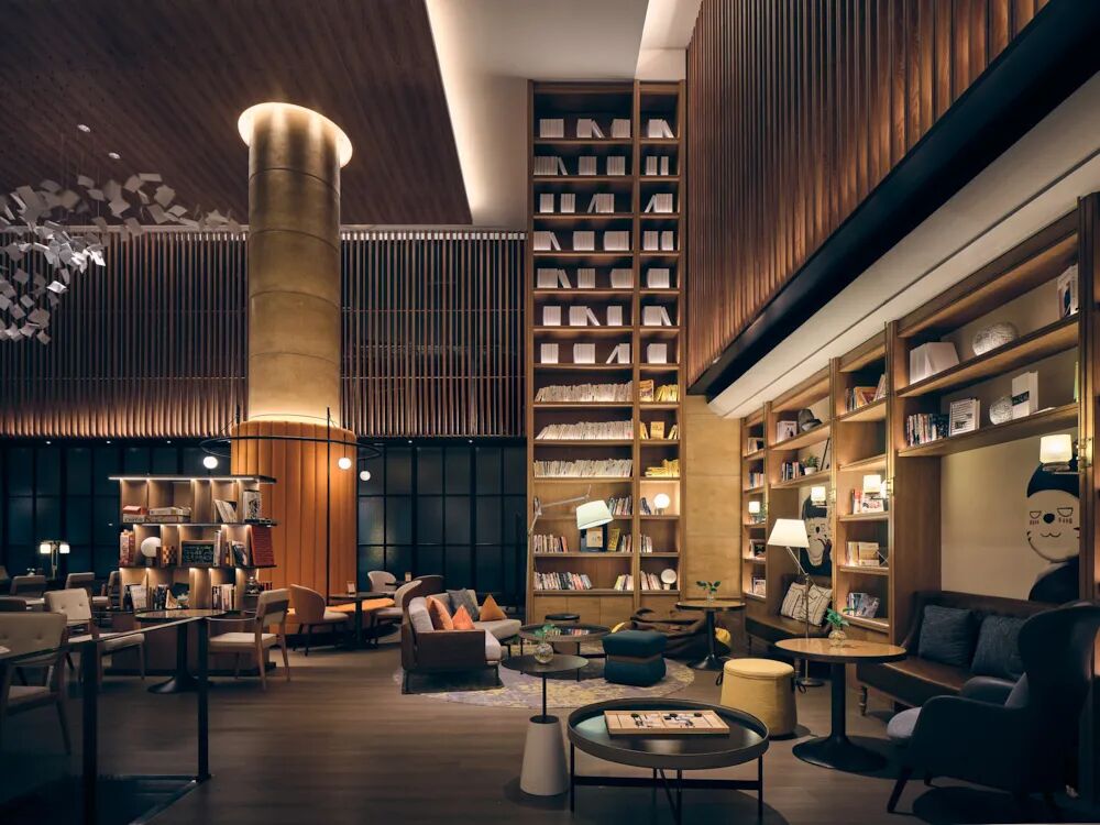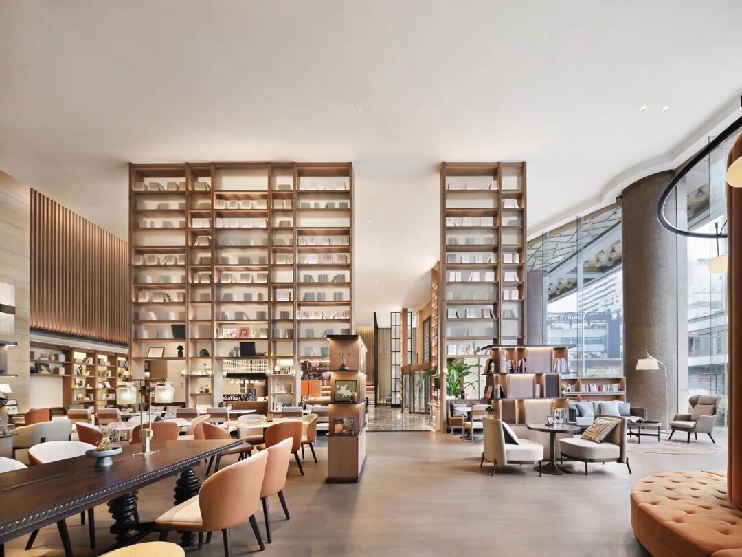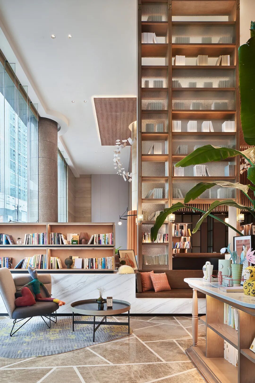 作为酒店对外展示的一张名片,万达颐华的大堂绝不仅局限于提供住宿相关的服务,它更是一个集书吧、咖啡厅、酒吧、时尚卖场为一体的“百变空间”。