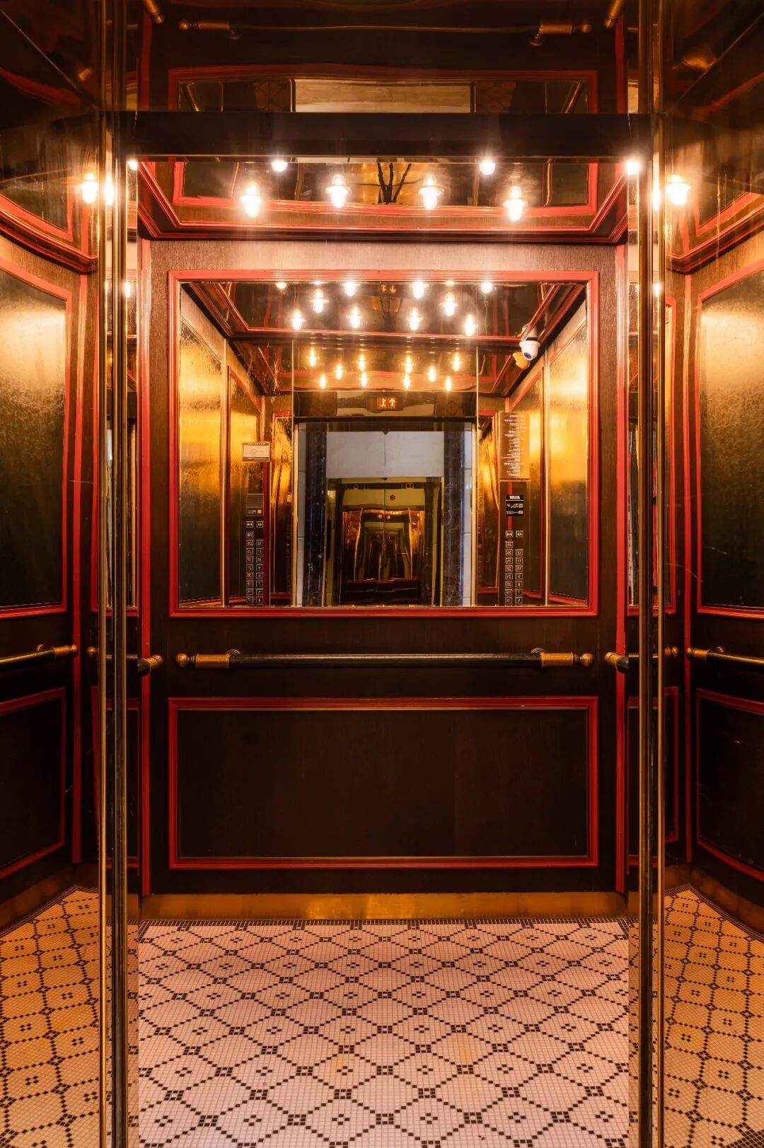 金色电梯保留了天地墙的硬装造型,内部装有Art Deco风格的做旧镜面。