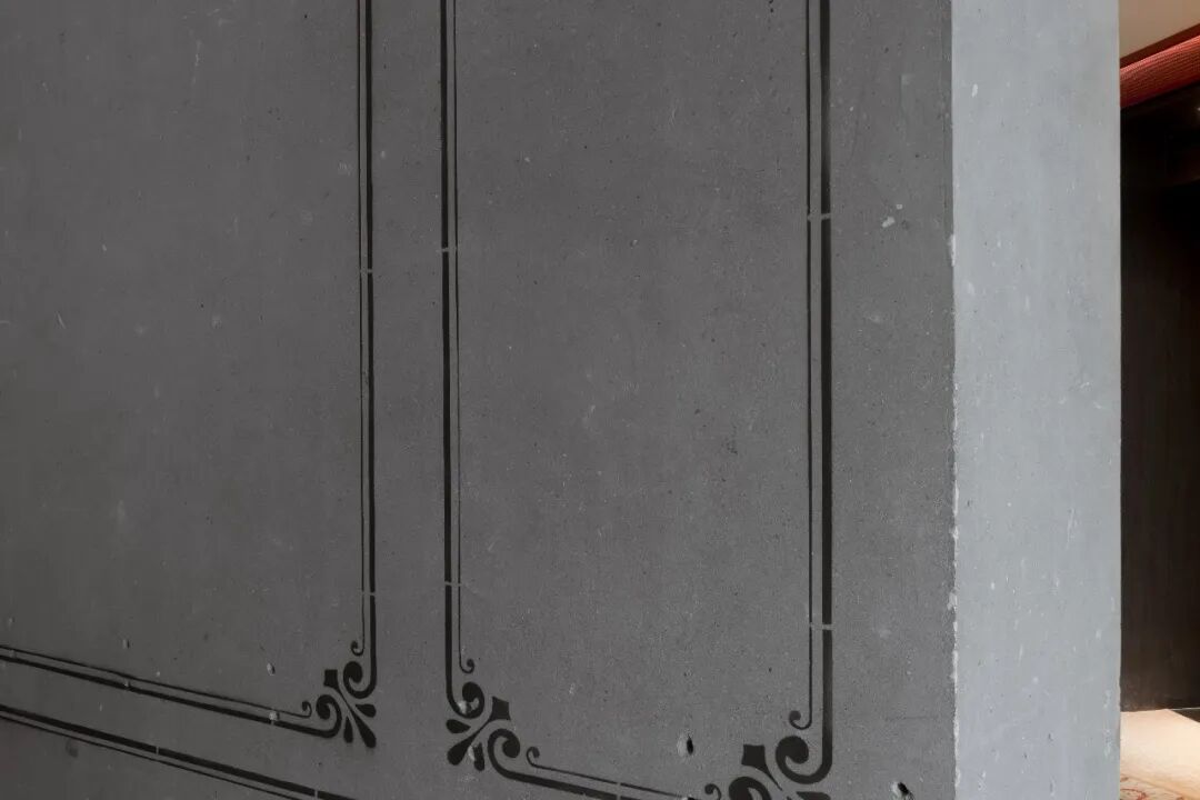 复古花纹的水泥墙面与红色金属天花 / 摄影:Simon©一筑一事