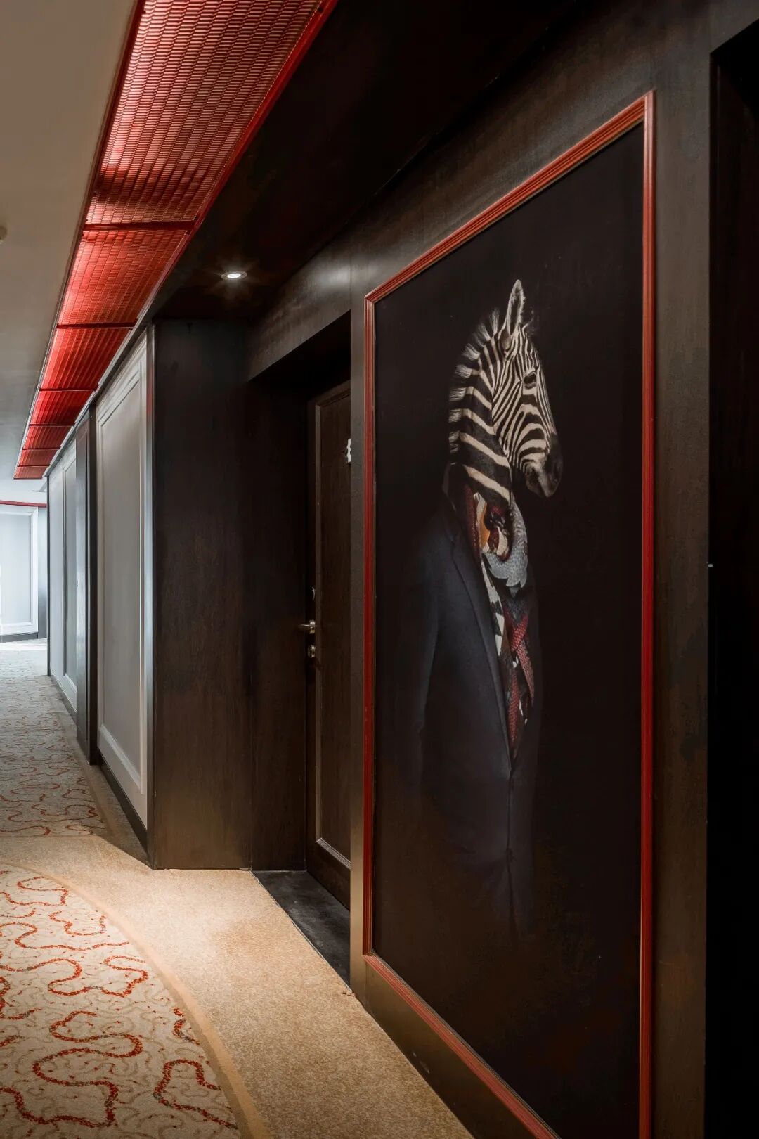 客房走廊像一条时光隧道,裸露的水泥墙面上,用拓印的方式印上了复古花纹。部分天花板用红色金属网遮挡,不但缓解了压抑,大胆的色系还传递出创新与活力。