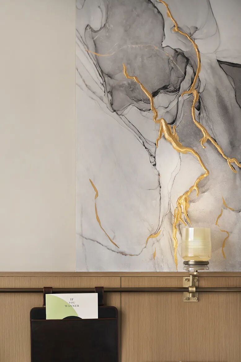 走进酒店大堂,8米的挑高依稀可见三十年前的雄伟,带有年代印迹的天然石材、超大尺寸的金箔木雕画、深海贝皮墙等,得到了很好的保护与再利用。