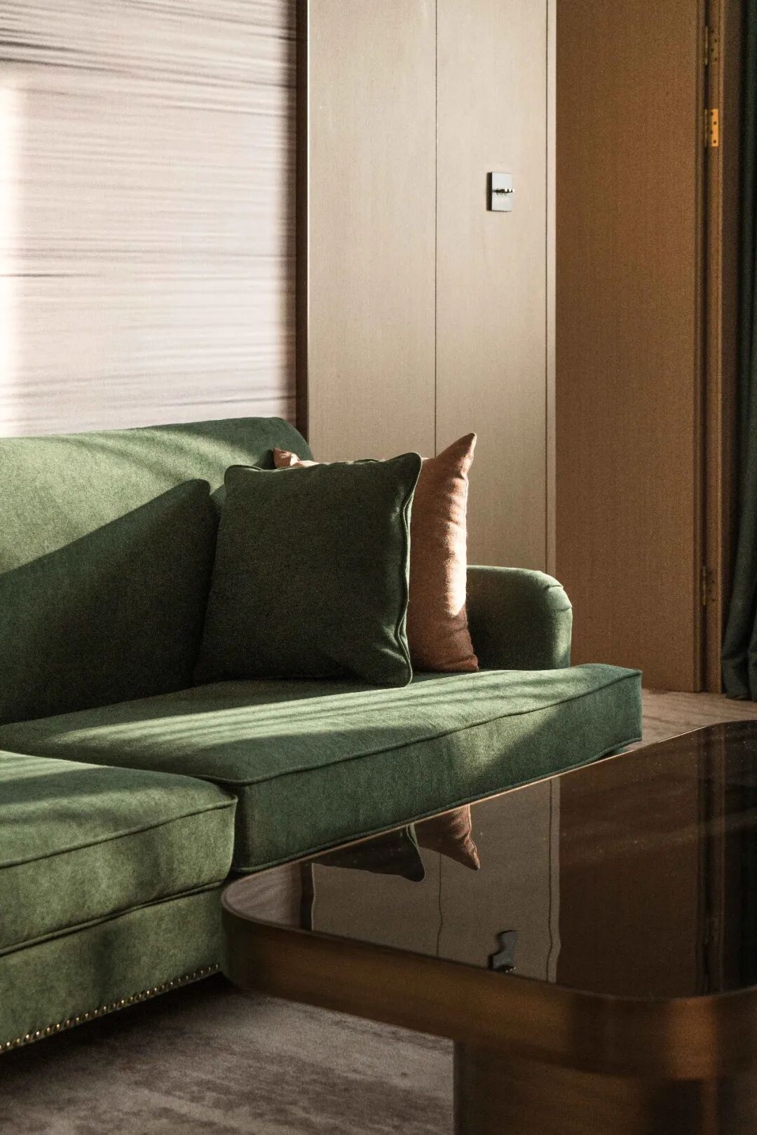 现代房型保留了原有的天花造型及隔墙,以淡雅的暖木色与复古摩登的墨绿色相撞,营造典雅精美的质感,光影穿透窗帘引入室内,婆娑晃舞,令室内的日常柔和而恬静。