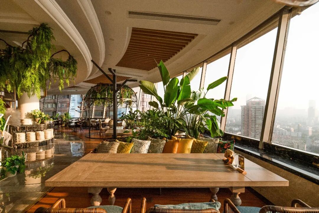 作为曾经的地标性建筑,酒店顶楼的旋转餐厅折射出90年代的奔腾与奋斗。改造后的万达颐华酒店保留了旋转餐厅欧式天花造型及全景采光的空间特性,将整层打造成一座空中花园。