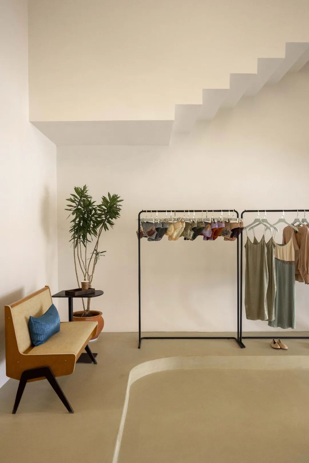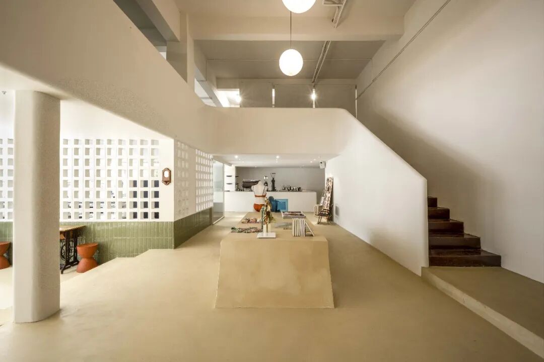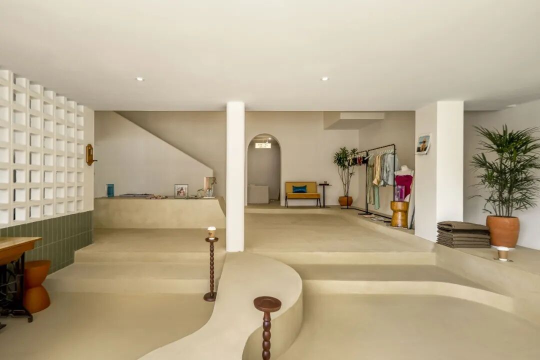 大面积的展示空间和咖啡休憩区由色块铺设,暗红、豆绿、米黄烘托起一个包容、轻松的空间。除了本身的动线设计,所有展示架、镜子、桌子等都可以移动,为空间的可能性和灵活性留白。