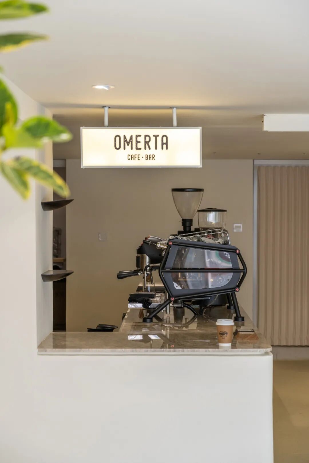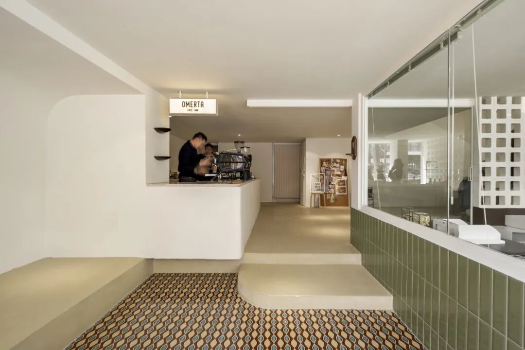 其整体空间分为上下两层,二楼作为办公区和仓库,一楼则包括咖啡区、工作间、展示空间和试衣间。踏入一个铺满复古砖的下沉式空间,OMERTA CAFE&BAR作为“店中店”,延续了自身恰到好处的复古感,以一盏简洁的灯箱巧妙地融入VOIMENT。