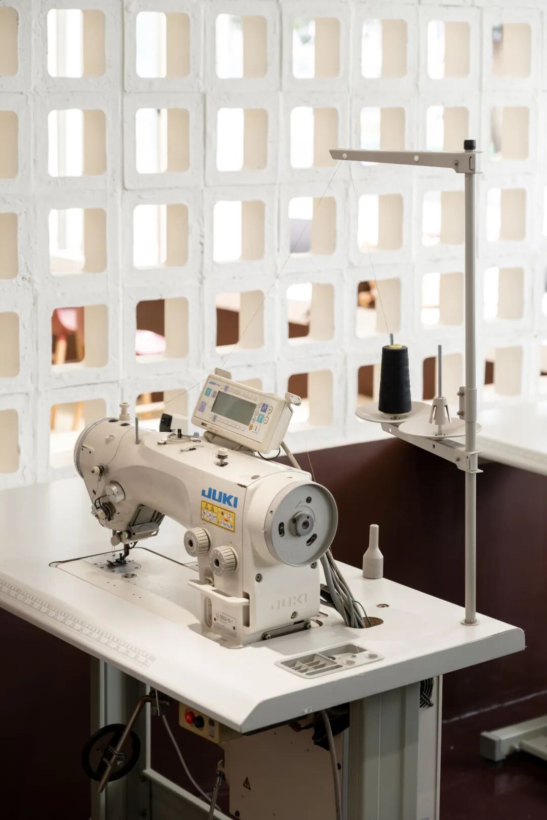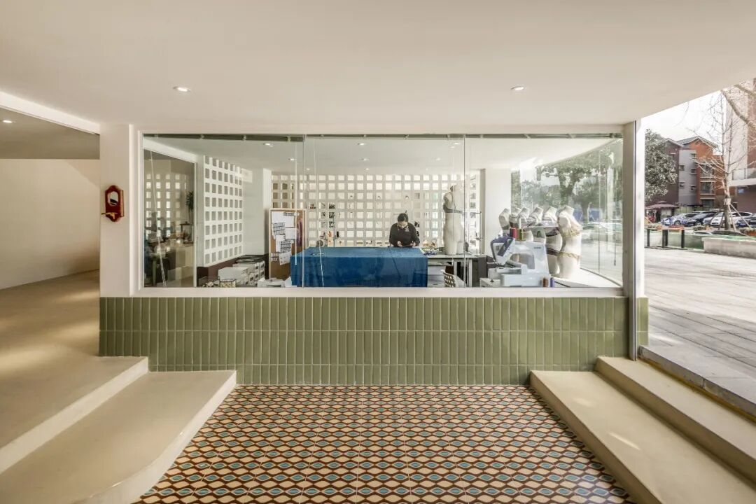 旁边较为瞩目的是用大面积玻璃和镂空隔断围合起来的工作间,同时这里也充当了橱窗。内衣设计的起点和终点都浓缩在这一空间。所有材料、设计稿、缝制工具有序排列,设计过程中产生的凌乱又为它增添生动可爱的一笔。