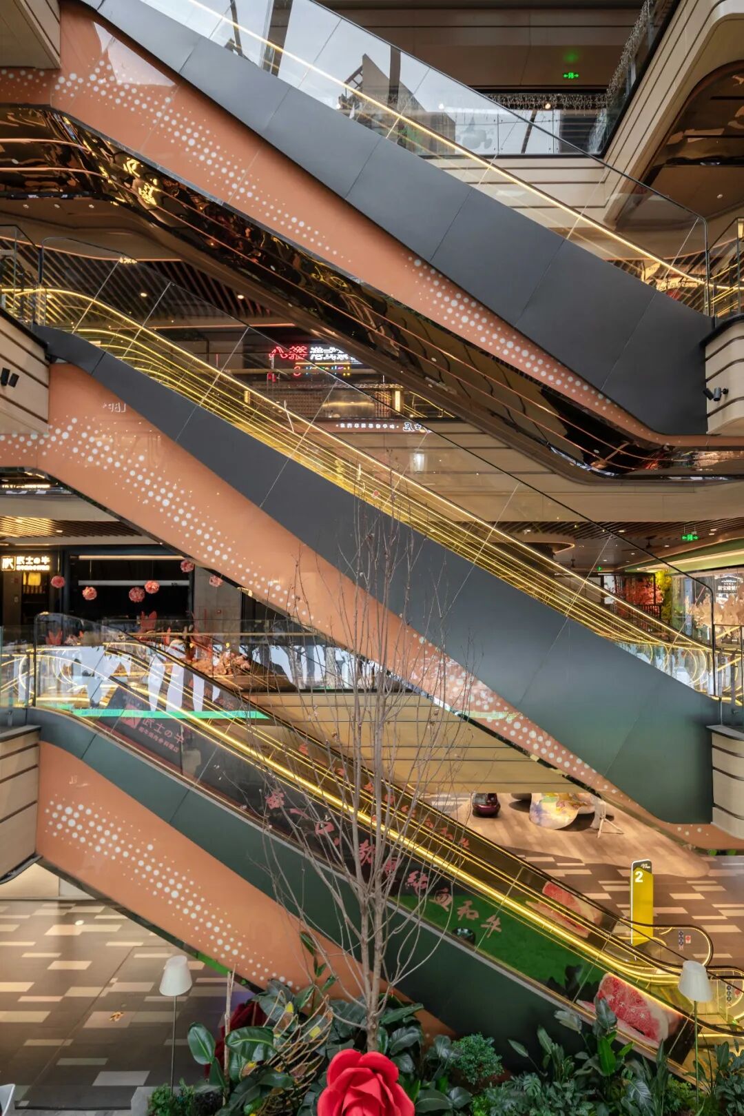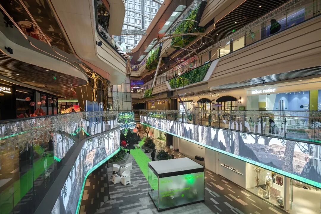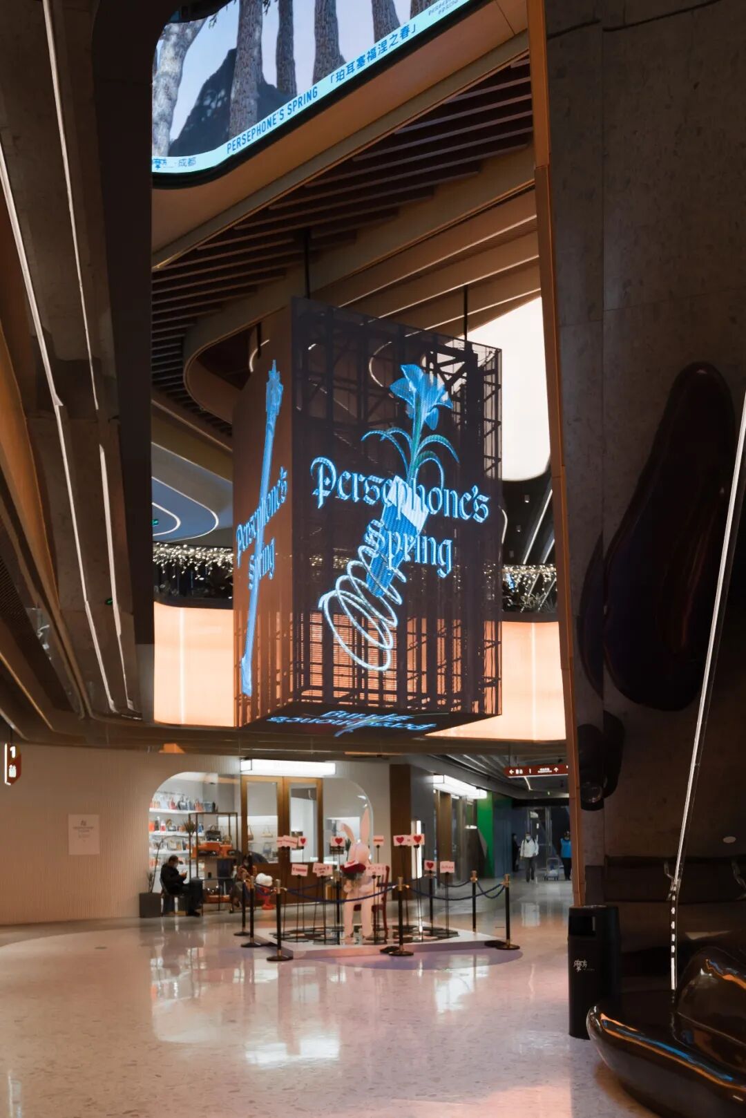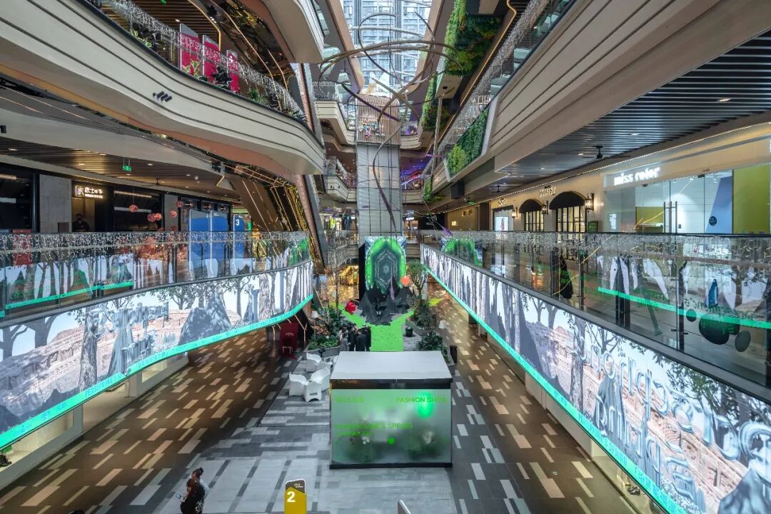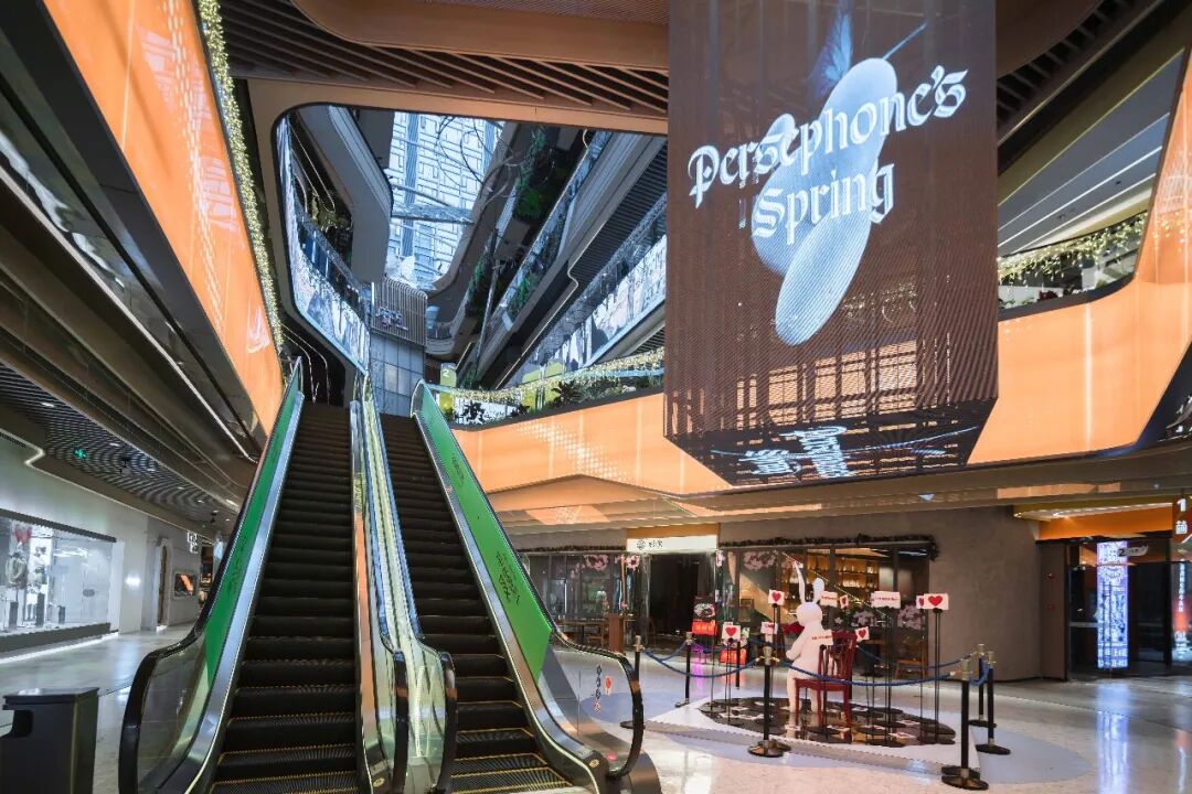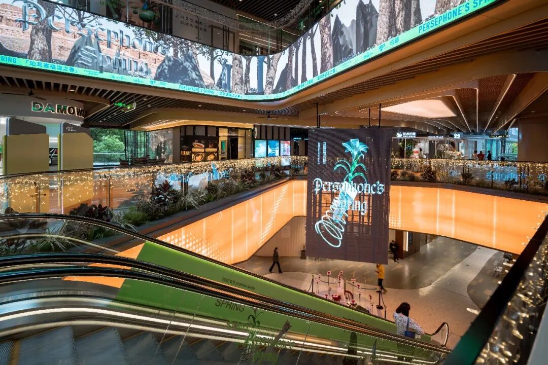 “森系建筑”、“绿洲内城”的概念也在空间中体现得淋漓尽致,尤其是中庭的区域,足够的层高、半开放的空间结构以及随处可见的绿植,形成了一个类似城市小公园式的空间,是「珀耳塞福涅之春」得以实现的条件。
