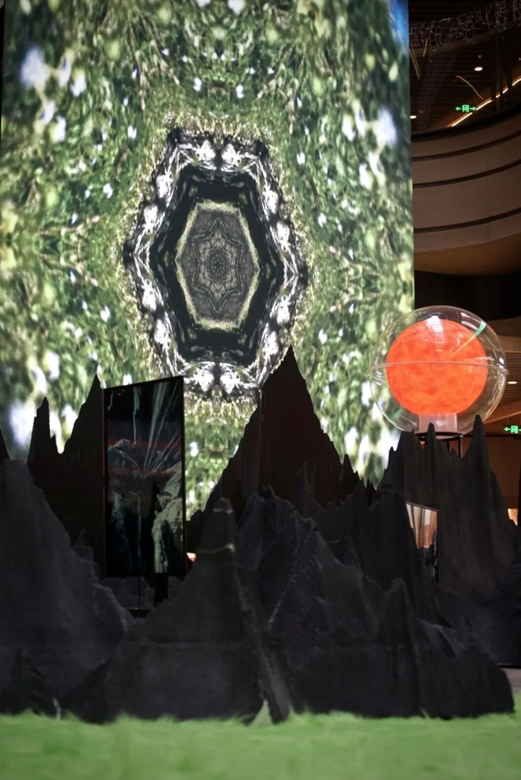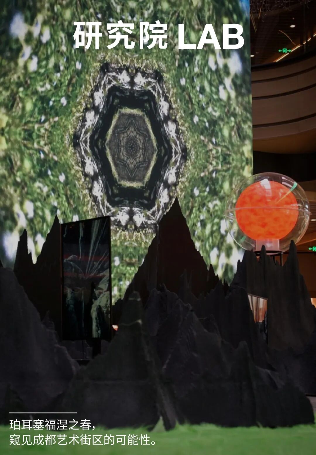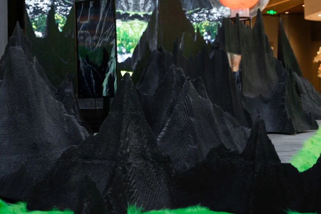 展览用仿自然造景与多媒体影像、声音景观、装置艺术进行有机结合的方式,依托合景·摩方(成都)的半开放式立体线形空间,在室内营造了一个非典型森林式场景。