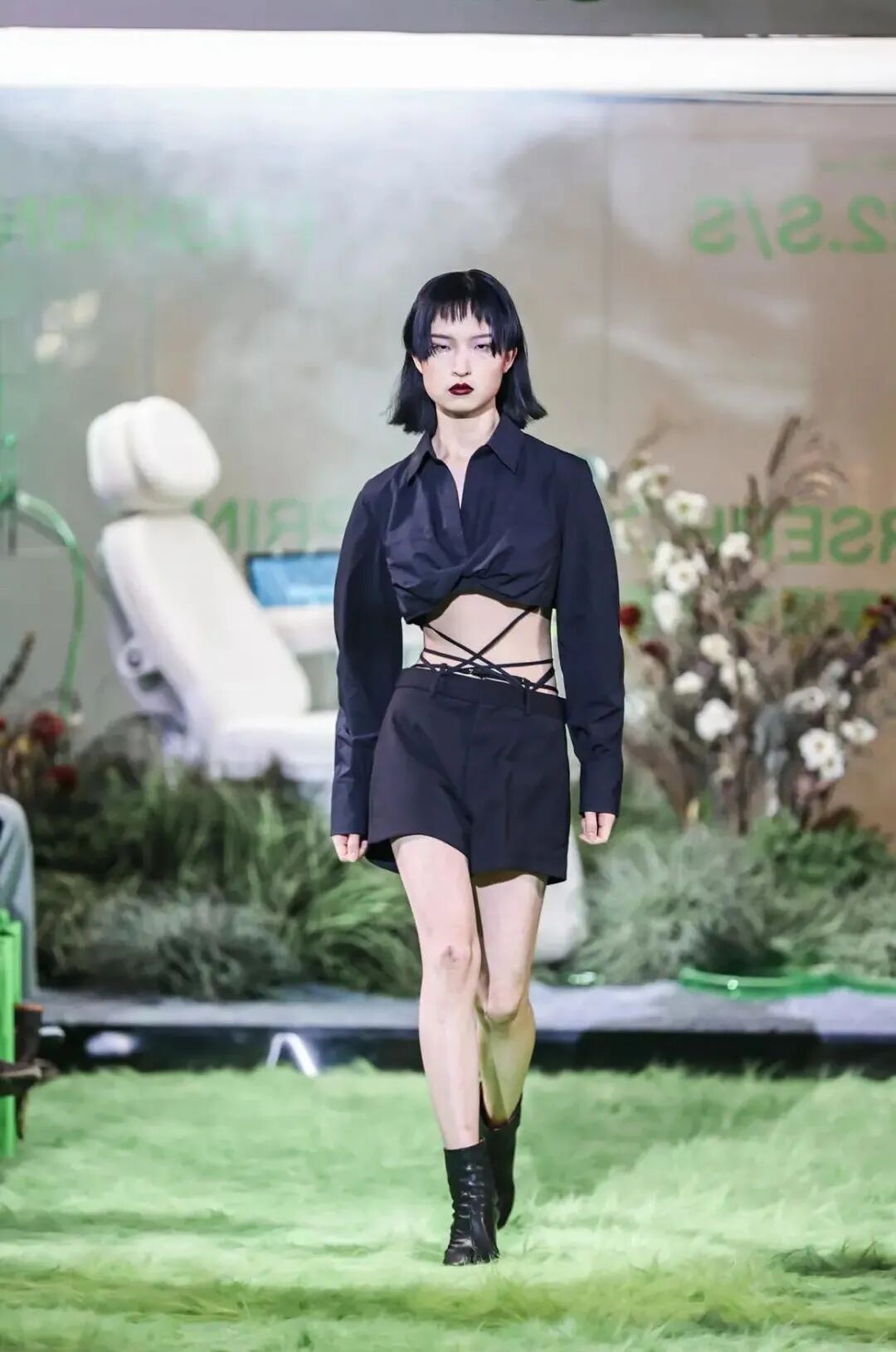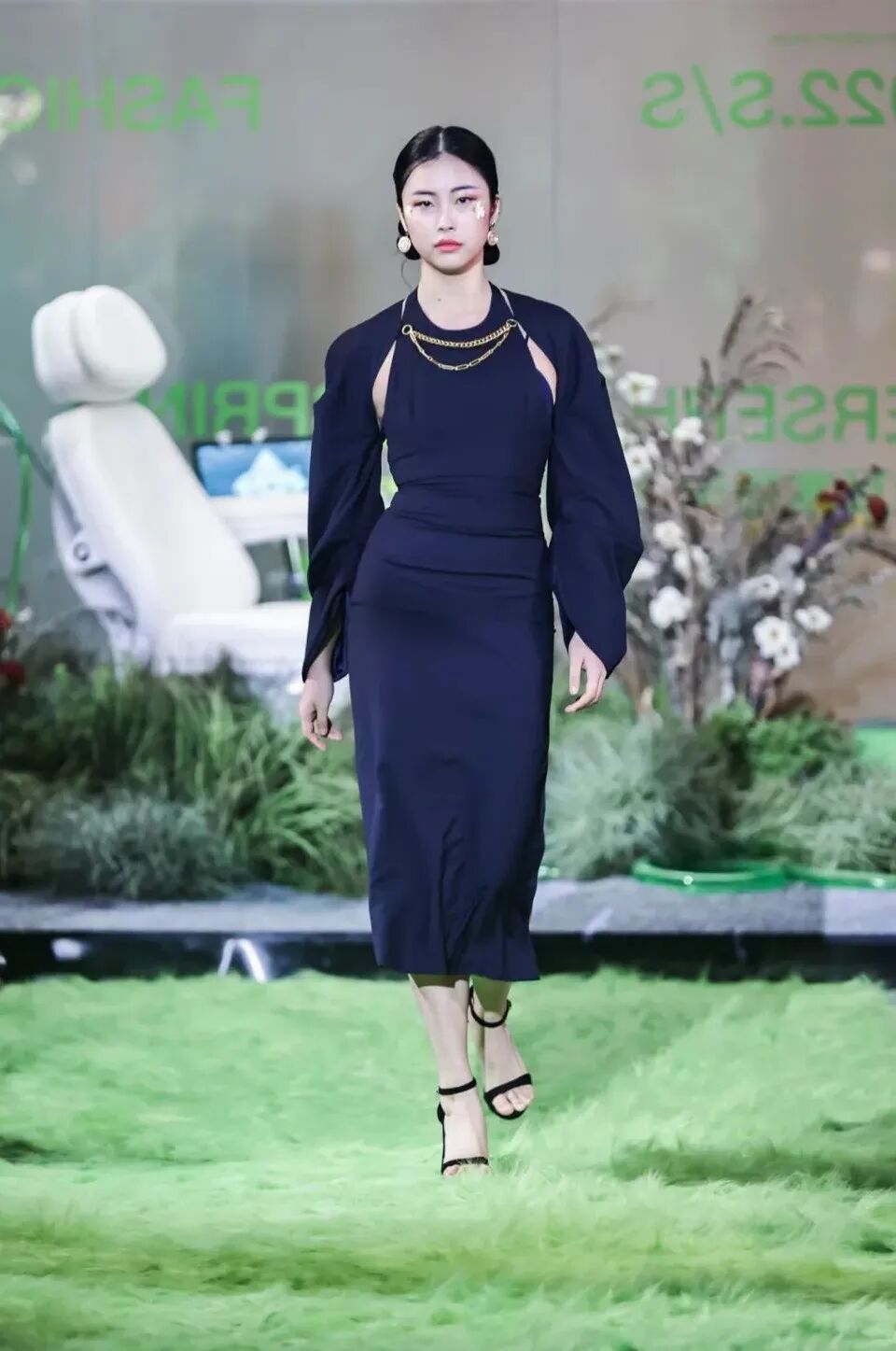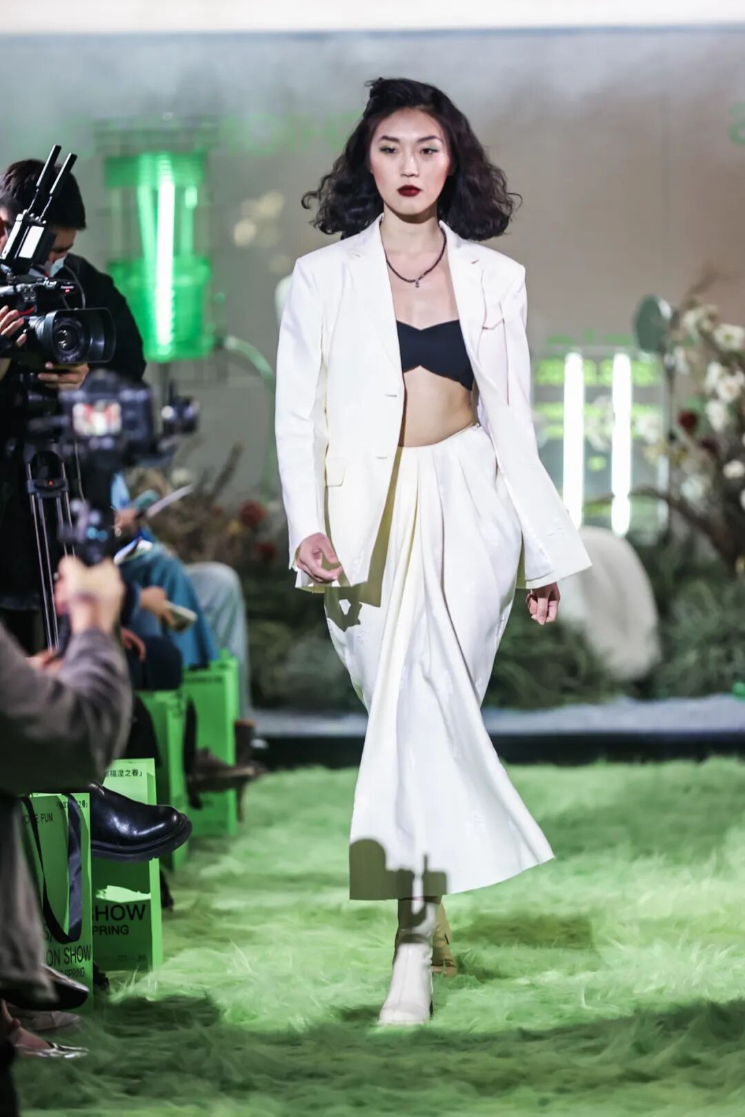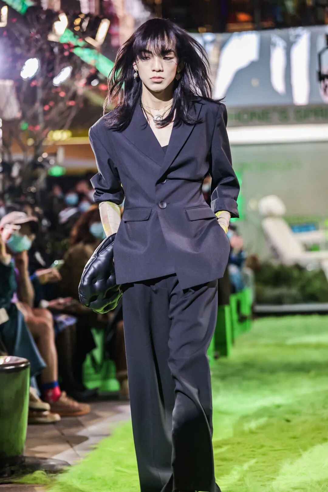 本次大秀的开场演出来自毕业于伯克利的独立音乐人张力友Boi-Charli,他坐在秀场的艺术装置中,以隐秘而多元的实验电子乐演出,将现场观众们拉入了「珀耳塞福涅之春」的世界。走上巴黎时装周舞台的中国面孔之一、国际超模王锐走入秀场,大秀正式开始。