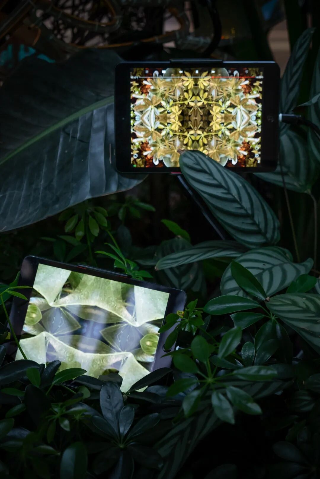 《德墨忒尔的神谕》(Demeter’s Oracle)则将实景拍摄的树干枝丫、绿萝植物、树叶杂草的图片与实物拼接,进行镜像反射的视觉设计,前后真景和数字艺术虚景结合,用多媒体技术将自然的边界模糊、重塑,制造出新的视觉风格。