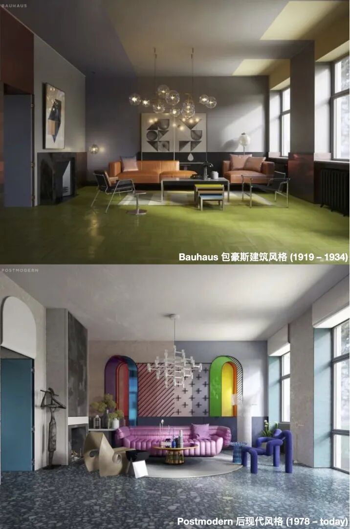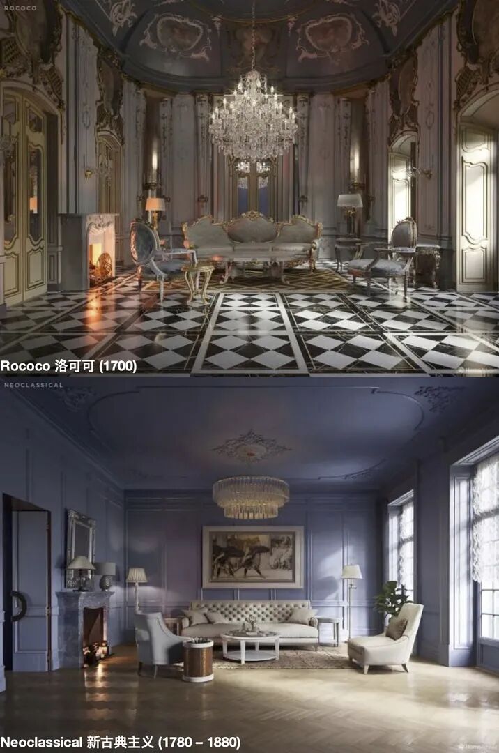 ⇪ HomeAdvisor的设计师创建了一个新项目,来展示在过去600多年里房间的装饰和设计是如何演变的,每个时代的审美意识都会催生新的美学风格。图:项目中部分风格展示