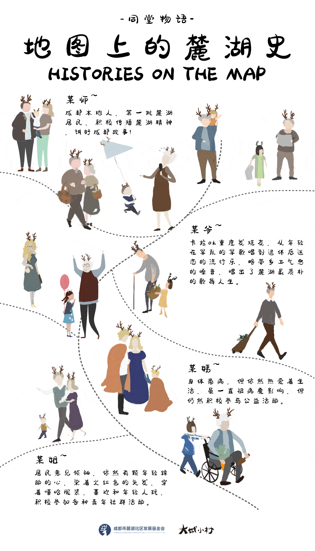 麓湖目前在青年社群方面已经做得比较成功,但对老年群体的关怀相对少,大城小村策划了一个活动,调动社区里的小朋友,去了解居住在麓湖的爷爷奶奶辈的故事,编写地图上的麓湖史。收集回来的故事,大城小村将邀请做儿童戏剧的老师编写成一个剧,将来由孩子们在麓湖演出。