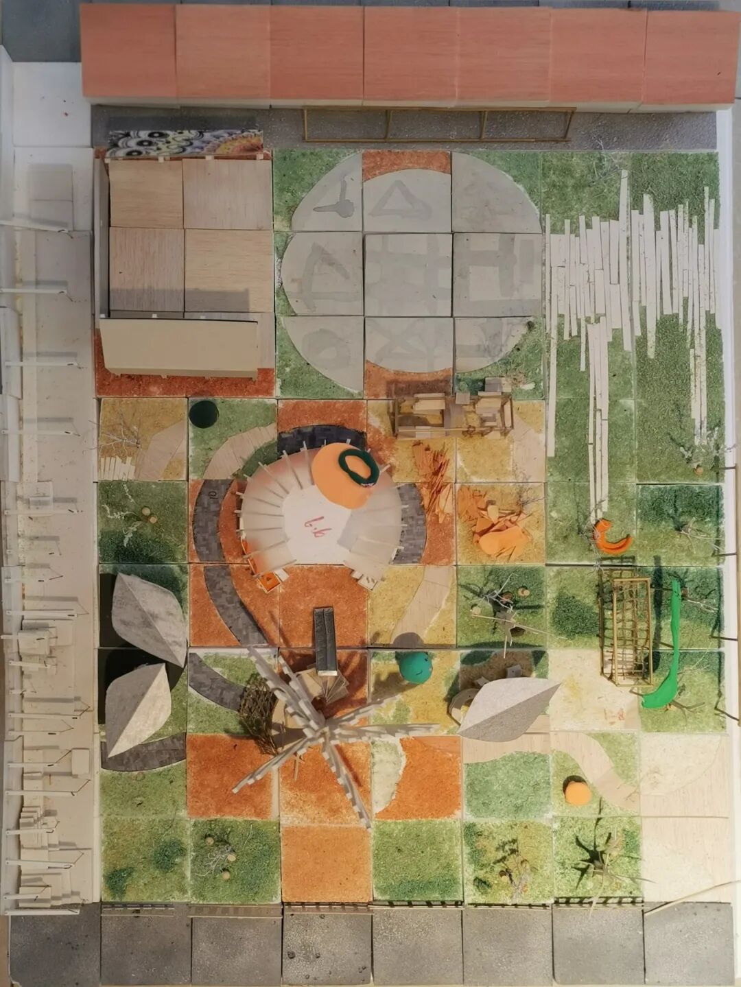 “人们把均质摆放的凳子移动到各处,所产生的聚合与分散,所代表着的其实是人们的聚集属性。而凳子的密集与否,其实也印证着社区中的积极空间与消极空间。”