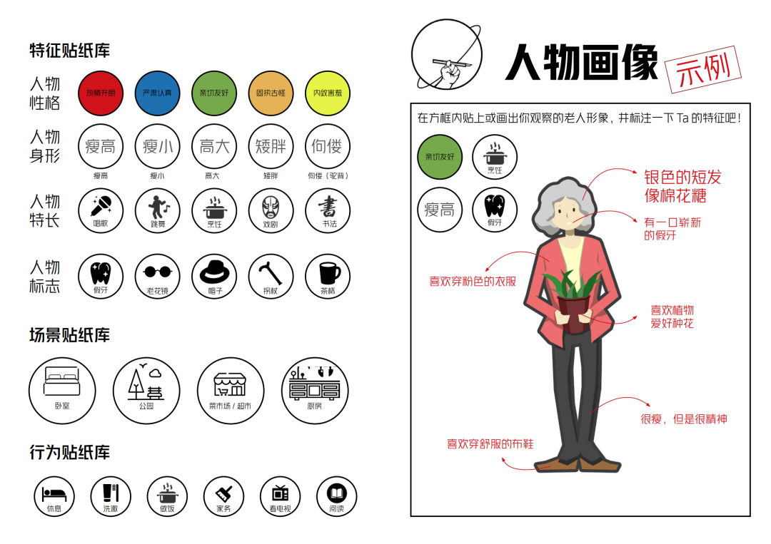 为了引导孩子们更好和老人沟通,大城小村设计出一套比较具体的工具包,比如在描述老人特征和状态的时候,有一套贴纸库可以供小朋友选择,包括人物身形、特长、标志物品、爱好等内容。