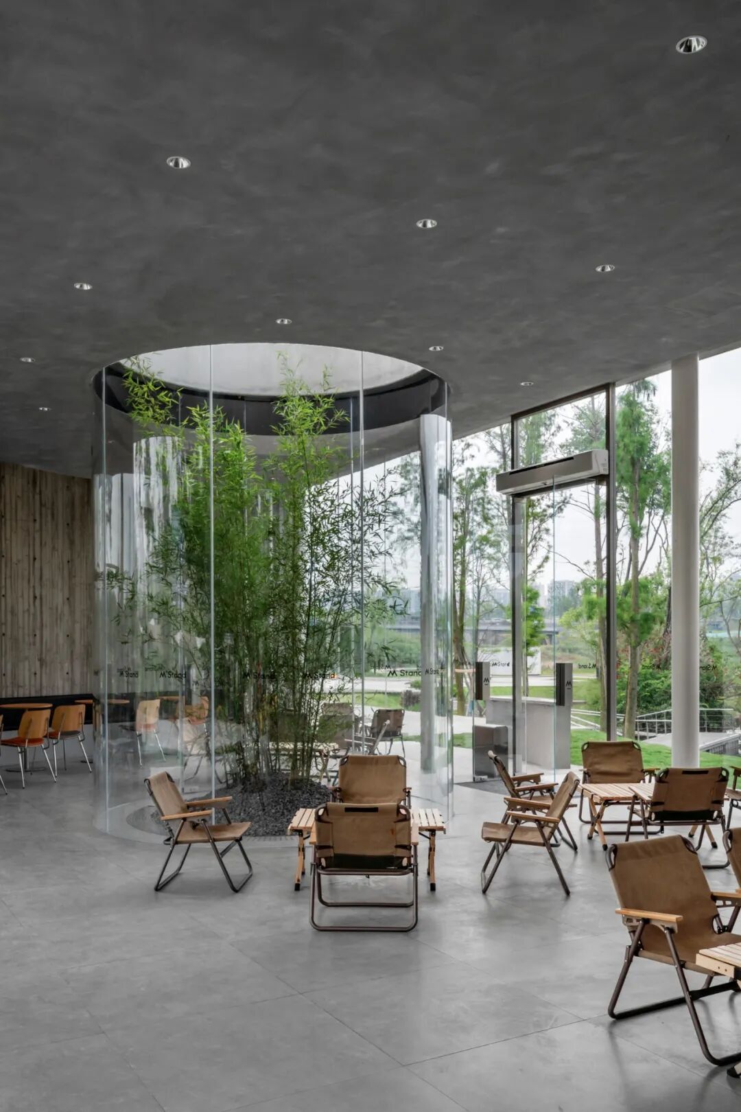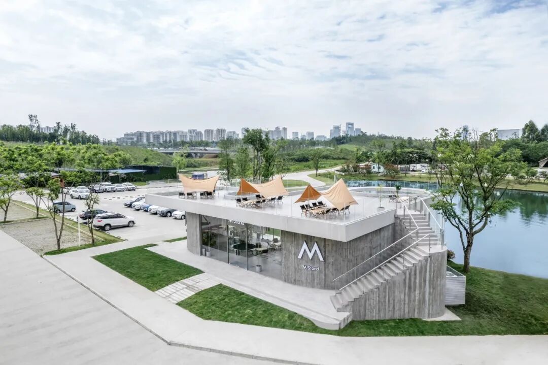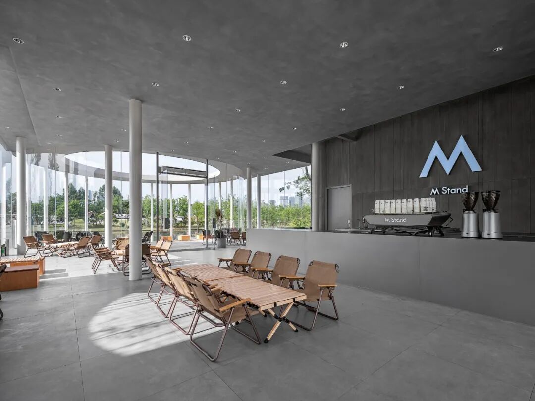 得益于麓湖独一无二的湖岛景观,M Stand“一店一设计”的理念获得了极大的发挥空间:半露天的悬挑空间延伸到湖面上,配合无框玻璃幕墙的包围,释放出一览无余的全景视野,让天府美食岛与店内空间互为风景。