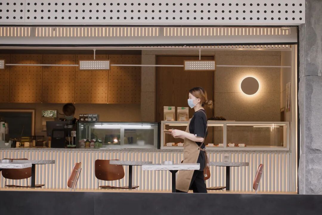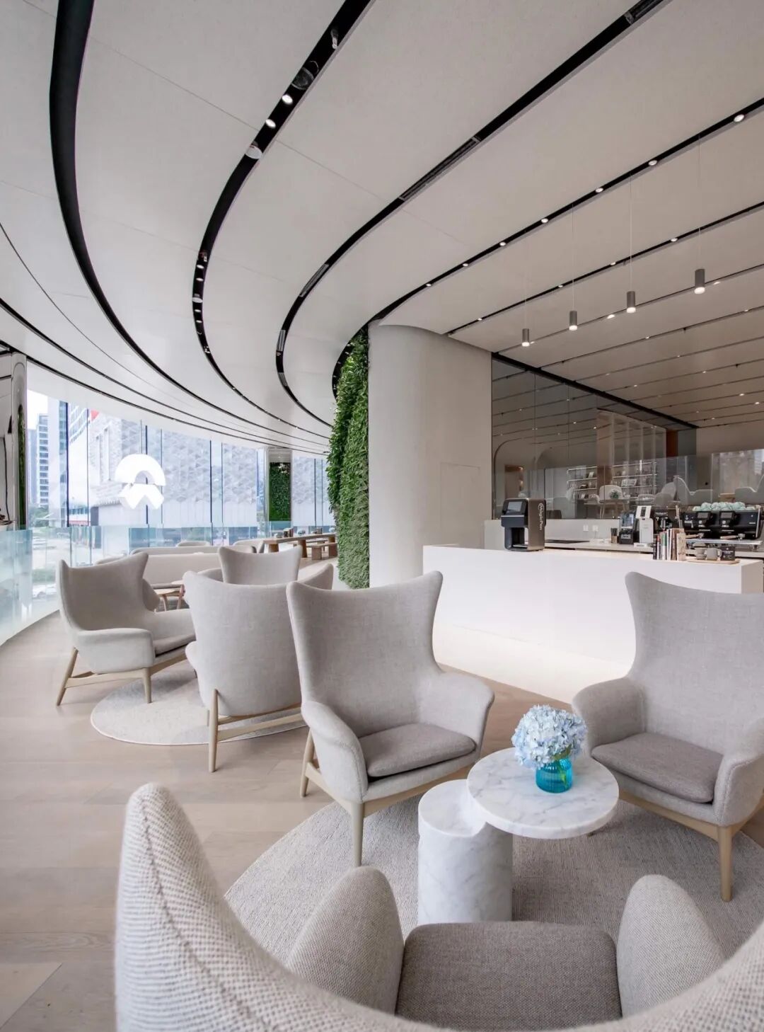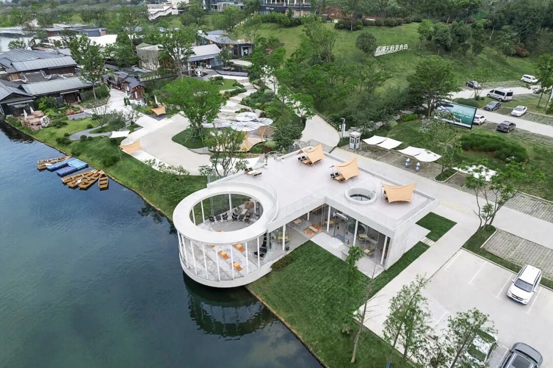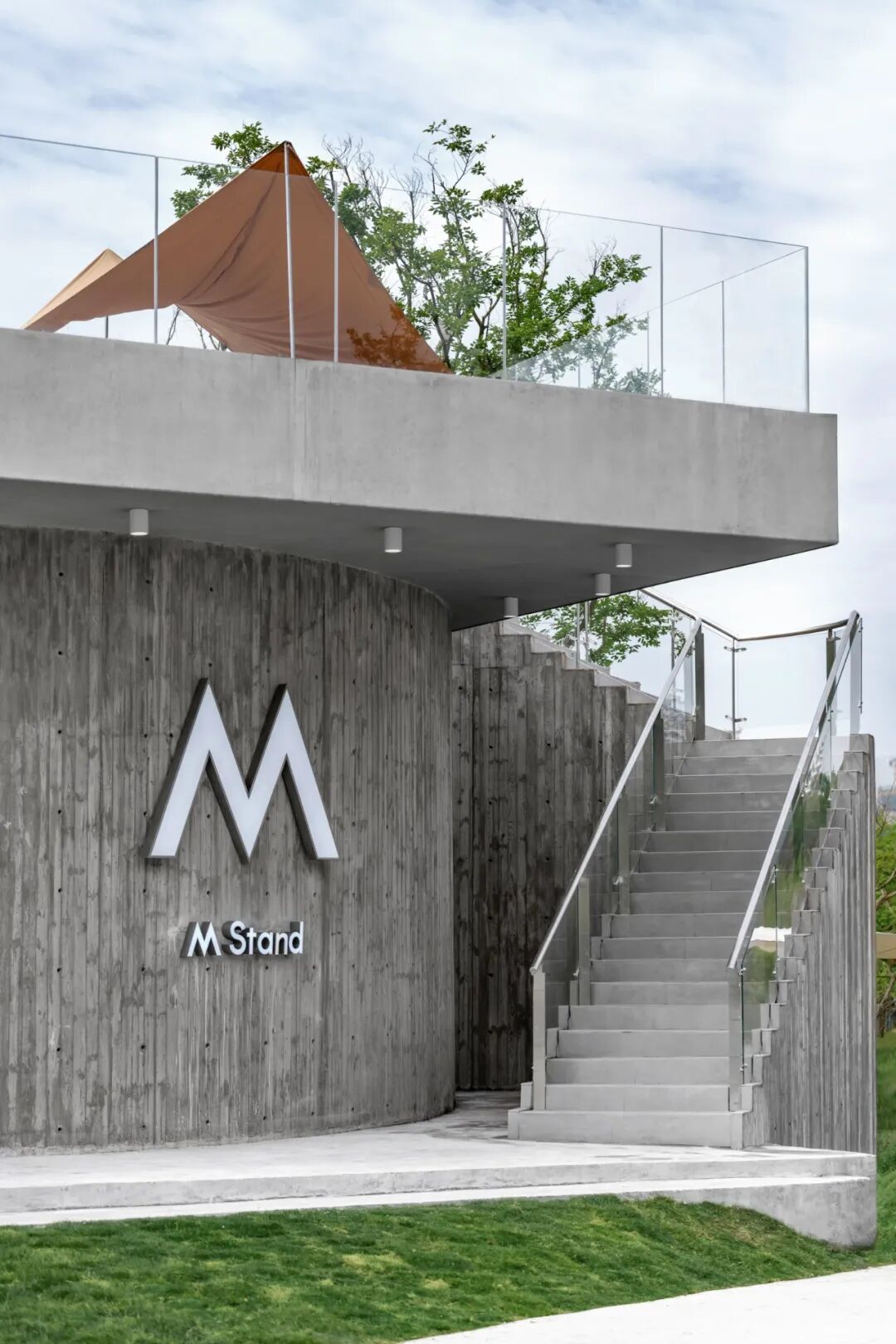 得益于麓湖独一无二的湖岛景观,M Stand“一店一设计”的理念获得了极大的发挥空间:半露天的悬挑空间延伸到湖面上,配合无框玻璃幕墙的包围,释放出一览无余的全景视野,让天府美食岛与店内空间互为风景。