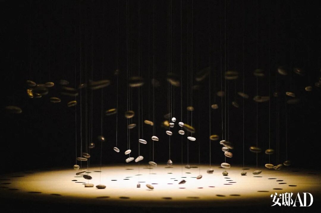 “正心My Minds”,在这里,我们可以看到艺术家梁绍基的宣纸上水墨作品《墨烛3》,由石头、鼔、机械装置组成的艺术品是汤杰于2015年创作的《石语》,石头有规律地碰击鼓面,发出一阵阵微弱而低沉的声音。图片来源于安邸AD