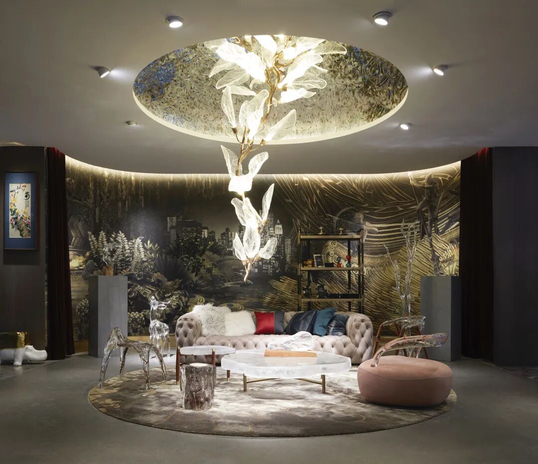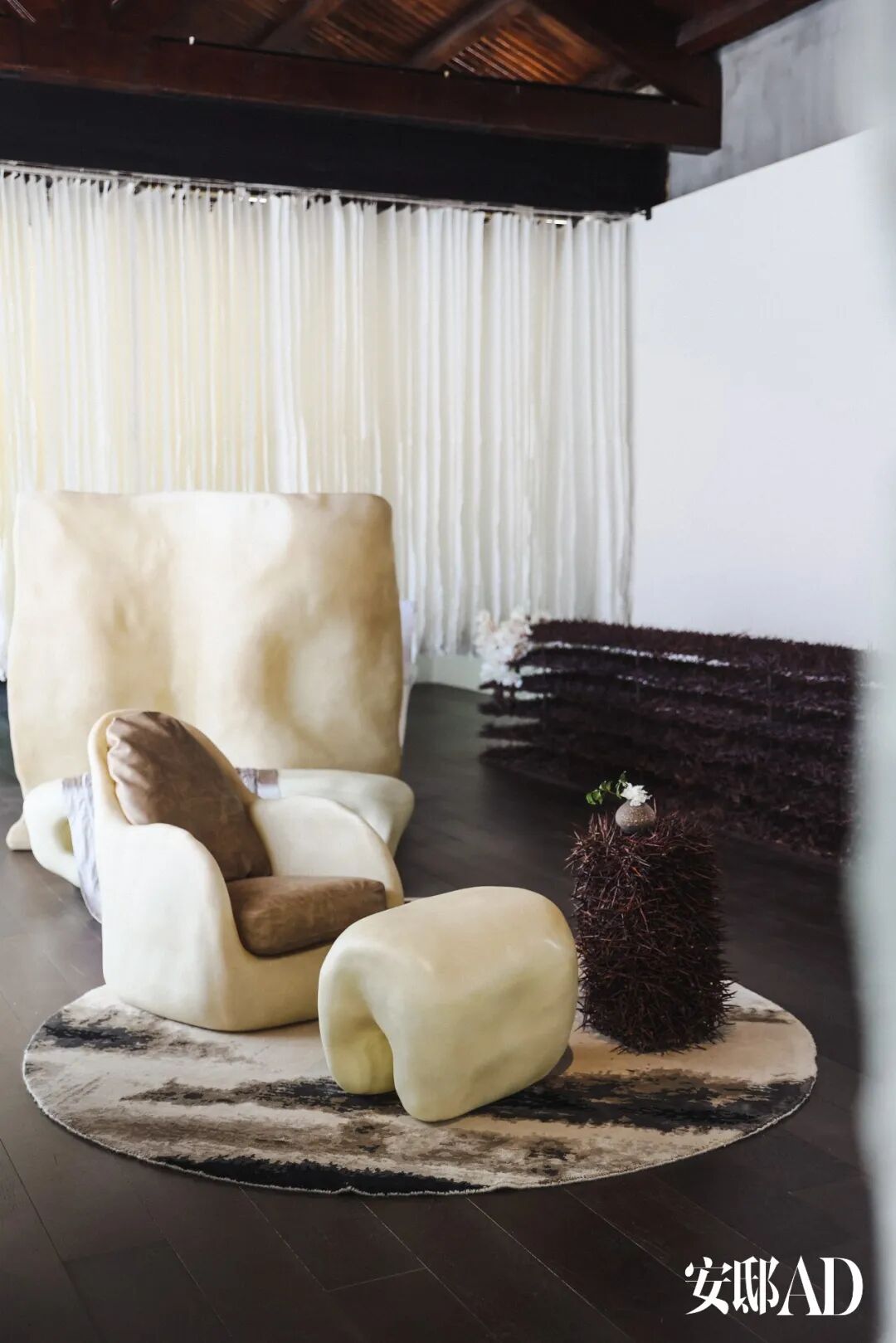 “格物 My Possessions”,在这个空间中,我们看到了许多充满隐喻的艺术作品的融合。艺术家丁乙的装置作品《飞来石》,艺术家邵一的雕塑《亲密5》,Marcin Rusak的Flora Table 280干花树脂餐桌,花艺师王紫打造的植物装置《不姜》。图片来源于安邸AD