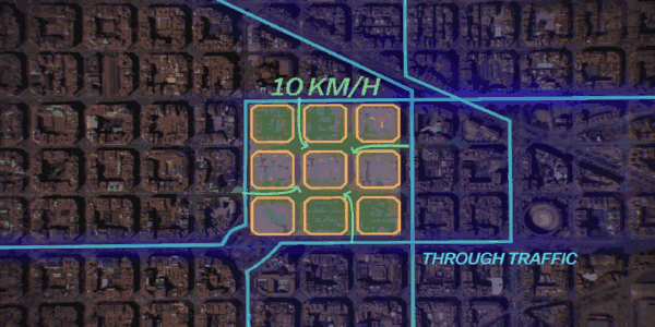 · 超级街区内部的交通流转方式,图源网络。巴塞罗那超级街区计划的核心是“行人拥有优先汽车使用公共空间的权利”。巴塞罗那将传统的9个方格街区合并到一起,封闭街区内部交通,巴士和重型卡车需要绕过整个区块从外部通行。超级街区内部车辆限速为10公里/小时,路边停车位被地下停车场替代。