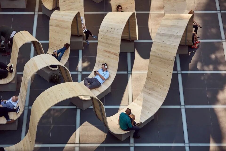 2019伦敦设计节(London Design Festival 2019)期间,英国设计师Paul Cocksedge带领自己的设计工作室Paul Cocksedge Studio,联手室内设计公司White&White,在伦敦最大的步行街区Broadgate的芬斯伯里大街广场(Finsbury Avenue Square)上打造了一件庞大的公共装置Please Be Seated,旨在改善步行街区的生活空间,促进行人、设施与空间的互动。