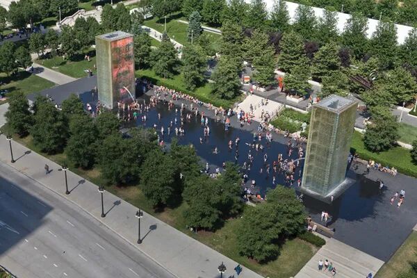 · 由西班牙艺术家Jaume Plensa设计的皇冠喷泉(Crown Fountain),位于芝加哥千禧公园西北一隅。设计上让观众作为艺术作品的一部分,强调了带入性的重要互动环节,巧妙地将游客带入其中。图源网络