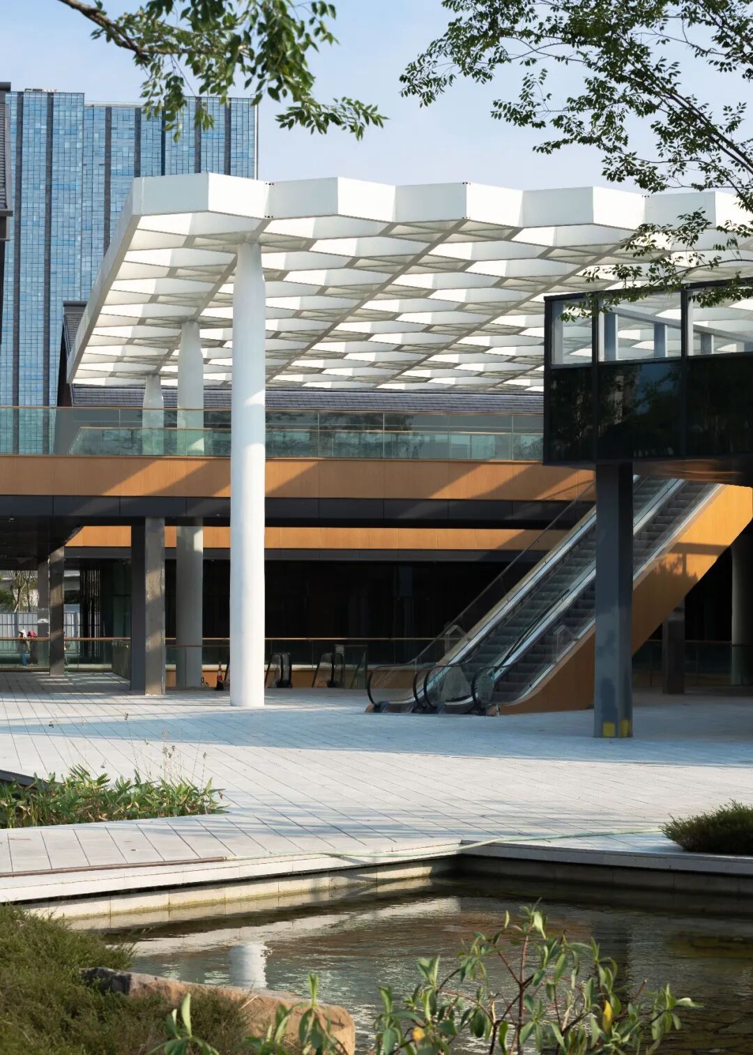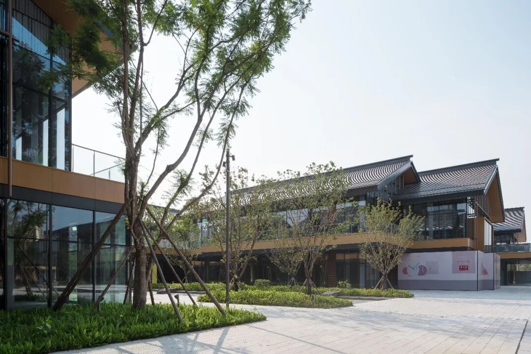 街区还引入了迎桂湖水,用街道与水景的互动营造出湖滨水街的公园式景观,柔化了商业街区与公园生态之间的边界,提升了街区环境的宜人感,也丰富了场景的多元程度。