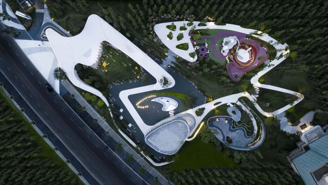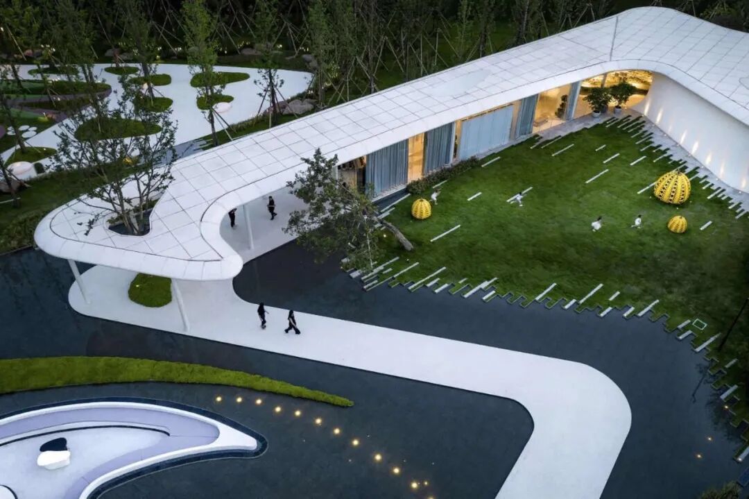 建筑外立面则采用“九天飞瀑”的东方意境作为设计概念,形态呈现气势磅礴的现代感,流动的韵律美感,景观设计与建筑的总体调性实现了整体与统一。