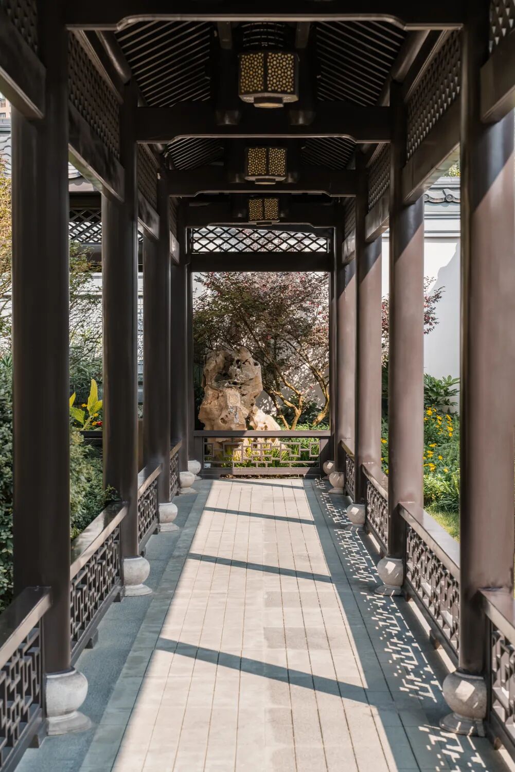 德商·锦江天玺汲取中国四大园林之一的拙政园的造景精髓,以山水自然为基调,以“一轴两园两坊五巷”为逻辑,遵循传统府院的平面布局,通过平均年龄70岁造园师傅的精心打磨,把江南水乡的苏杭园林复刻至成都三圣乡。