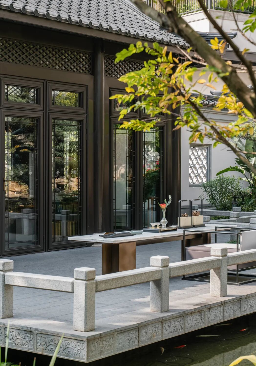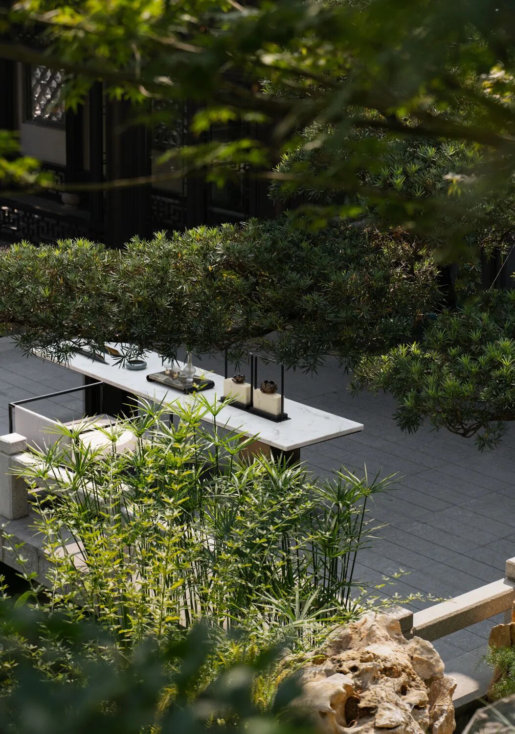 建筑师还在入户区、大平层区和合院区分别设计了三个独立中庭,在天际大平层的围合空间中做出一个有层次感的度假风中庭园林。而合院墅区则设计了与之匹配的中式古典园林。