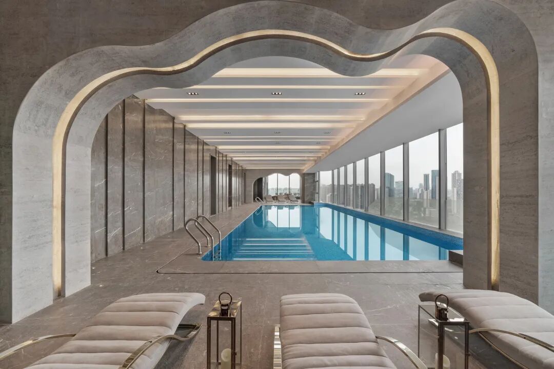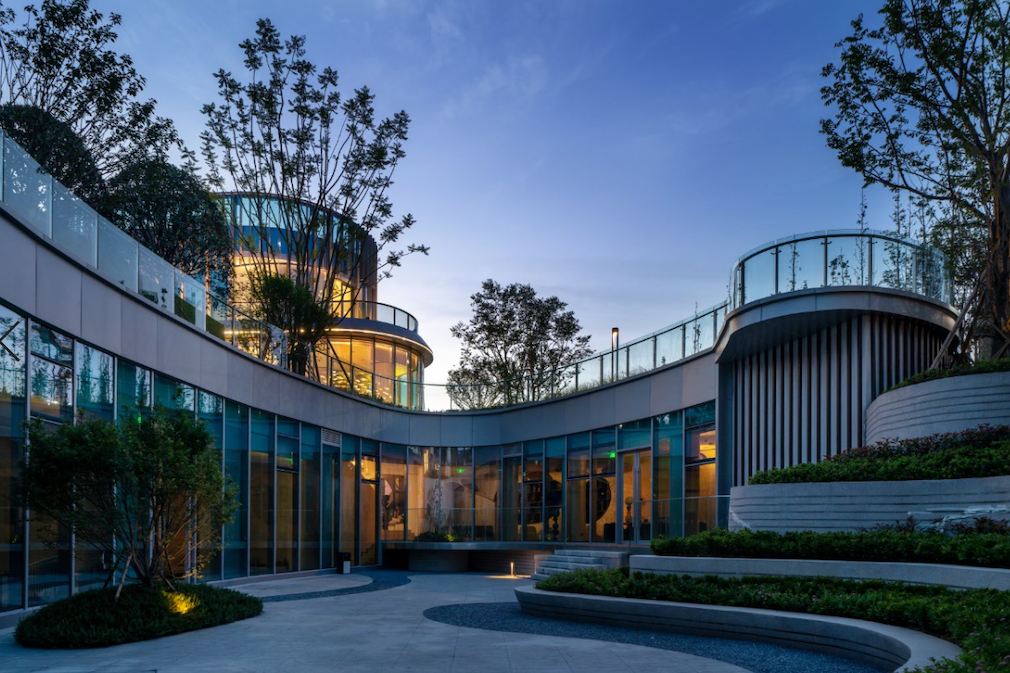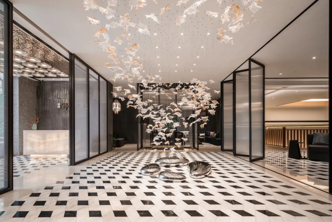 与自然的融合是麓湖熙华天玺最突出的景观美学特征,高芳口中的设计主题“森居”的元素在空间中随处可见,“抽取山川、河流、跌瀑的艺术形态,回归生活本质,感受阳光、树木、花草、流水与环境的默契,让空间自然而然地‘流淌’在都市之中”。