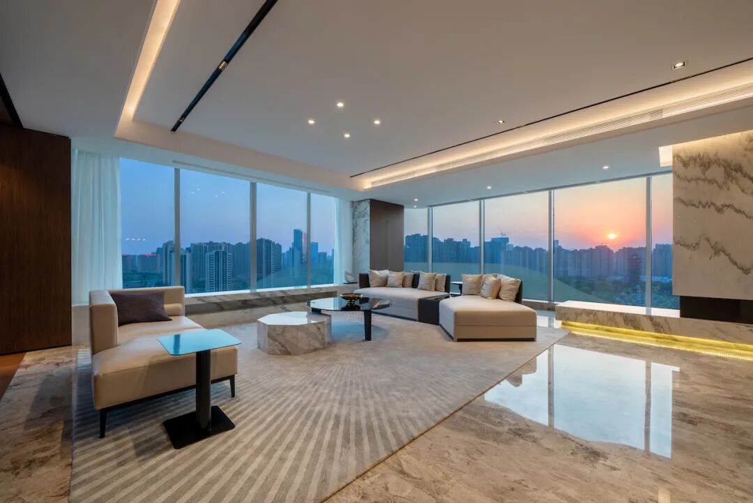 锦江天玺则将阳光这个奢侈品完全收入囊中,建面约230平米户型的270度三面采光、连续45米全景落地窗铸就城市天幕大宅,既保证了空间的明朗,又保留足够的私密性。